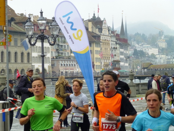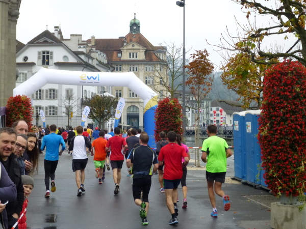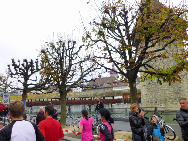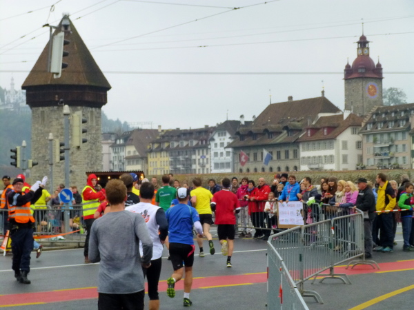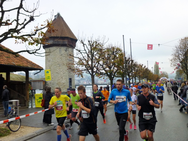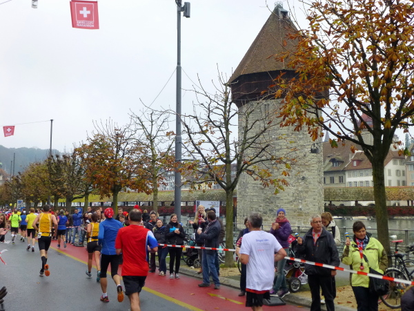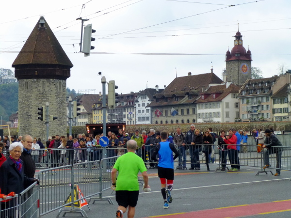 Und hier erwartet mich gleich die nächste Neuerung: Anno 2008 war das Innere der Altstadt noch tabu für uns Läufer gewesen und wir wurden via Seebrücke direkt zum Start-/Zielbereich zurück gelotst. Das ist seit letztem Jahr anders. Unmittelbar vor der Seebrücke zweigen wir nach links ab und folgen der Reuss flussaufwärts. Die Bilderbuchkulisse der Kapellbrücke mit dem Wasserturm und der Altstadt im Hintergrund begleitet uns.