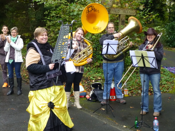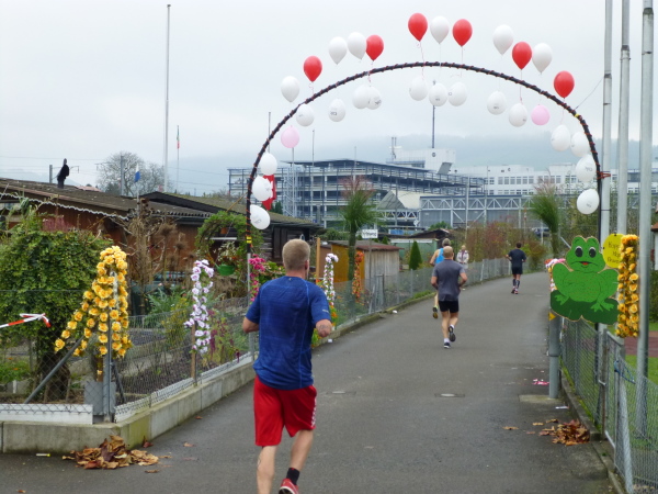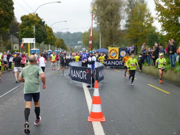 Wie schon damals gilt aber auch heute: Die Ernüchterung kommt bei km 23. Hinter dem KKL bin ich mit meinen marathonischen Mitstreitern auf einmal allein unterwegs und es gibt auch nur noch wenige Zaungäste, die diese Einsamkeit kaschieren. Anders als auf der Runde eins bleibt uns das Gewerbegebiet hinter dem KKL erspart und wir dürfen mit einer herrlichen, herbstlich eingefärbten Allee vorliebnehmen. Nicht erspart bleiben uns allerdings die 20 + 30 Höhenmeter im Folgenden, die sich auf Runde zwei nun schon mehr als Berge denn als Hügel anfühlen. Umso mehr schätze ich auf der zweiten Runde die dichte Streckenversorgung. Etwa alle zwei Kilometer gibt es Wasser und meist auch Isotonisches, Bananen und Energieriegel, zuletzt zudem Gels, gereicht von Hundertschaften engagierter Helfer.