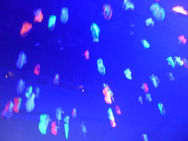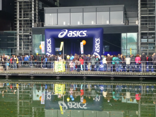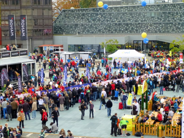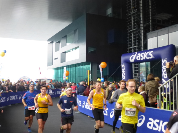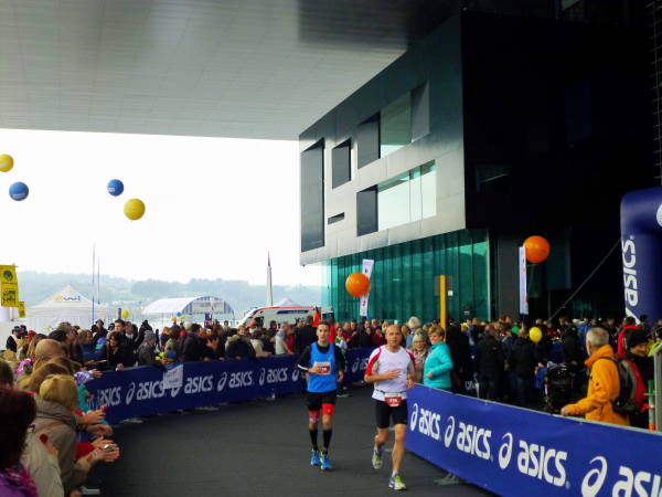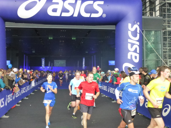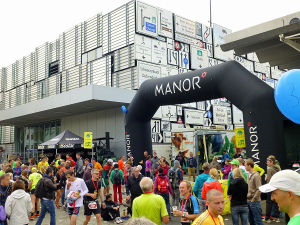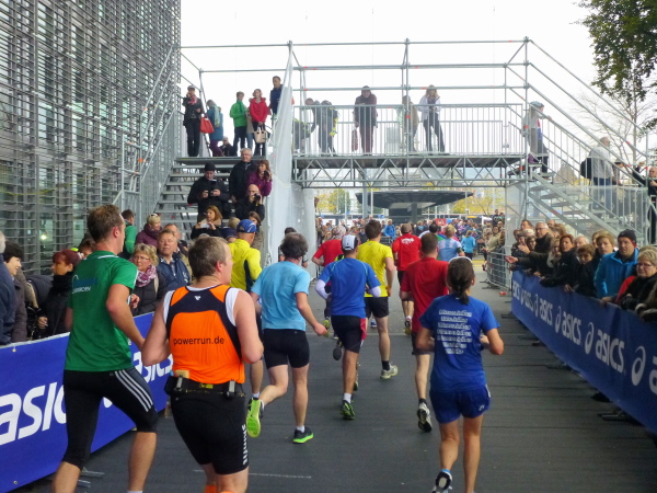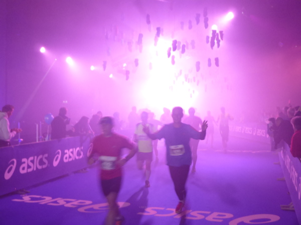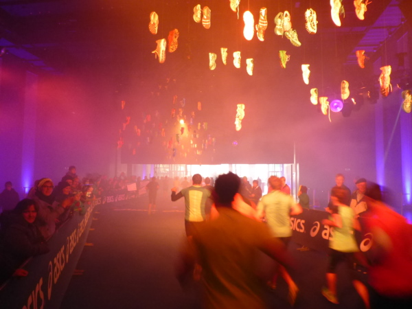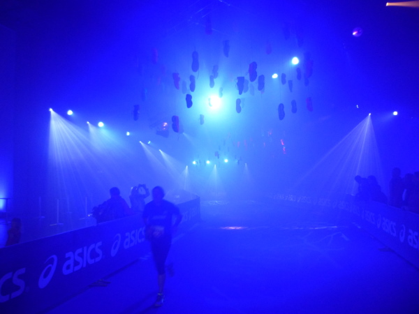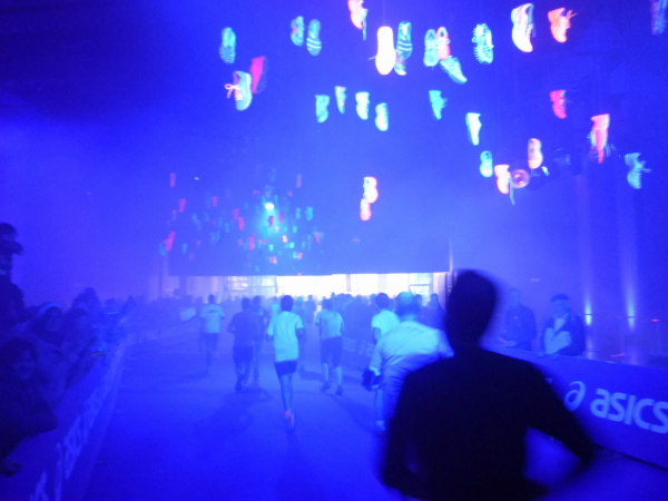 Spätestens das sich bei km 19 vor uns aufbauende KKL signalisiert uns: Wir sind zurück. Im Herzen der Stadt. Und das heißt: Raus aus dem Outback, rein in einen Hexenkessel. Vor sechs Jahren führte uns der Kurs noch außen um das KKL herum. Das gilt heute nicht mehr. Denn seit 2012 geht es mittendurch. Durch das rückwärtige Tor des KKL tauchen wir von einem Moment zum anderen ein in eine kunstnebeldurchwaberte schwarze Höhle, diffus von farbig grellem Licht durchzuckt, erfüllt von tosendem Applaus und krachenden Beats. Von der Decke baumeln Hunderte geisterhaft schwarzlichtbeleuchteter Sportschuhe. Ein wahrlich marathonisches Gesamtkunstwerk. Und ganz profan gesagt: Der absolute Hammer! Ich komme kaum dazu, all das wirklich aufzunehmen, schon bin ich wieder draußen und finde mich mitten auf dem Europaplatz.