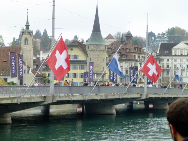 Über die Reussbrücke, ausgelegt mit einem Teppich in den Schweizer Nationalfarben, dürfen wir die Flussseite wechseln. Und rein geht es in die schmalen kopfsteingepflasterten Gassen. Vorbei an den oft überbordend mit Malereien verzierten und mit prächtigen Zunftzeichen behangenen mittelalterlichen Fassaden ziehen wir von Platz zu Platz: Weinmarkt, Kornmarkt, Kapellplatz heißen die Stationen. Wunderschön ist diese Passage, nur fliegen auch hier die vielfältigen Eindrücke viel zu schnell vorüber. Ehe wir uns versehen, haben wir unseren Altstadtausflug am Schwanenplatz direkt am See schon wieder beendet.
