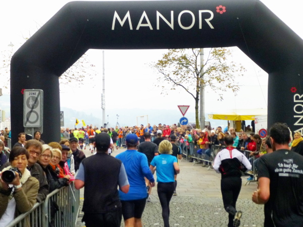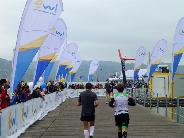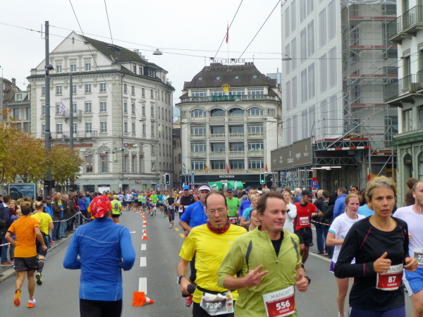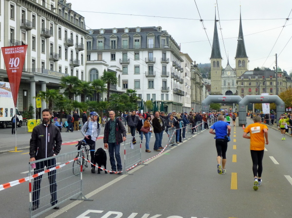 Kurz und schmerzlos ist der Wendepunkt. Einfach mal 180 Grad gedreht und schon finde ich mich selbst auf der Spur der Schnelleren wieder, wo ich mir anschauen darf, wer, was und wie da noch hinter mir dahin trabt. Wegen der dichten Scharen, die mir entgegen kommen, ist für mich zunächst noch kaum fühlbar, dass sich das Feld auf meiner Spur kräftig ausgedünnt hat. Und so koste ich ein weiteres Mal die grandiose Stimmung auf und an der Strecke aus, die mir via Schweizerhofquai, Schwanenplatz, Seebrücke und KKL entgegen schlägt.