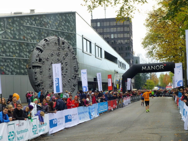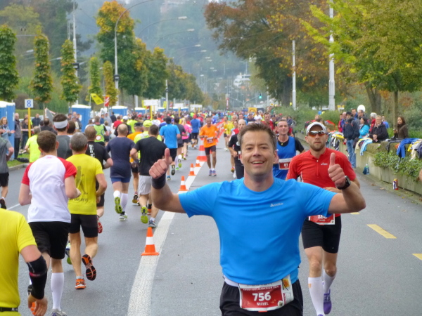 Bei km 20,5 ist es soweit: Der gemeinsame Lauf der Halb- und Vollmarathonläufer endet hier. Mit anderen Worten: Für vier von fünf Läufern geht es geradeaus weiter zum Finish im nahen Verkehrshaus. Jeder fünfte hat sein Ziel noch nicht erreicht und muss / darf in die 21 km-Ehrenrunde.