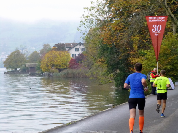 Hinter Kastanienbaum ab km 30 wird die Einsamkeit noch ein wenig größer. Am See entlang höre ich außer dem leisen Getrappel der Schuhe keine anderen Geräusche mehr. Die Sicht über den See hat sich leider nach wie vor nicht gebessert, dennoch empfinde ich dieses Streckenstück, gerade auch als Kontrapunkt zu den Volksaufläufen in Luzern und Horw, als eines der schönsten und entspannendsten des Rundkurses.