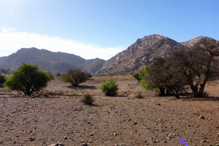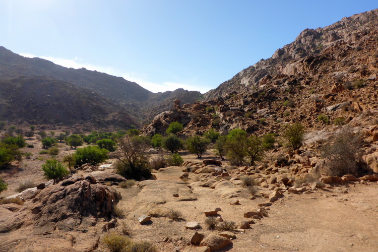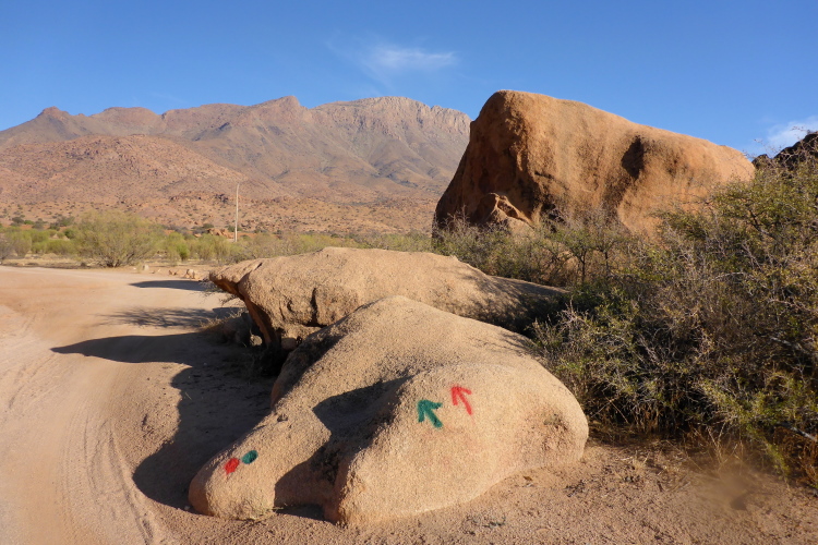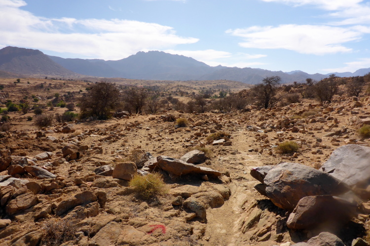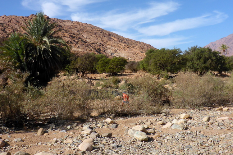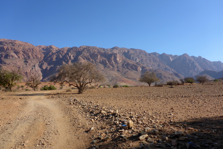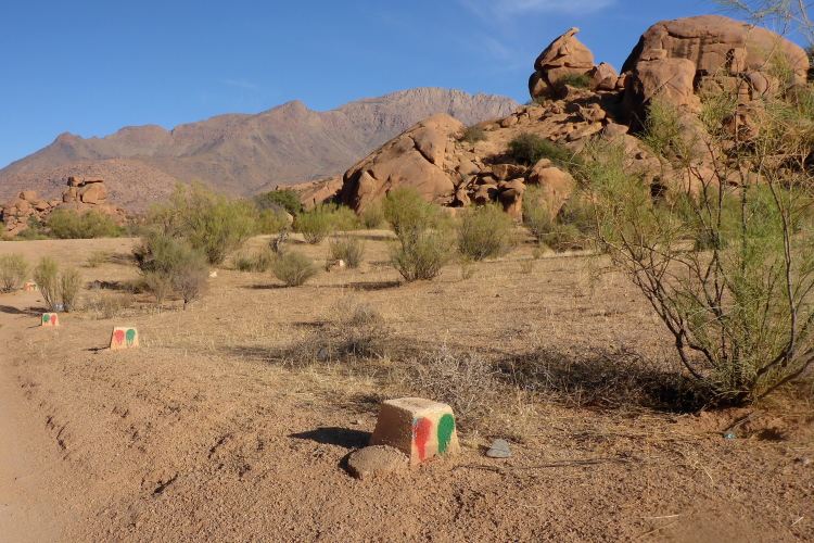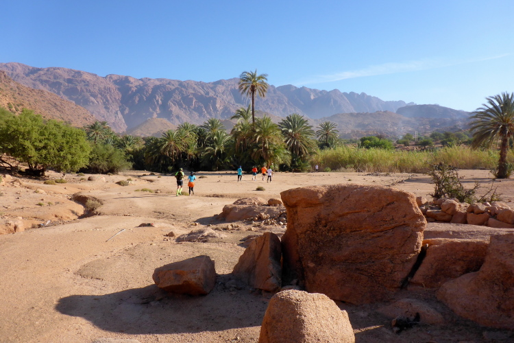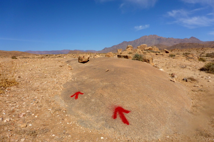 Als der rosa Granit abrupt aufhört, stehen wir genau auf der Kontinentalgrenze zwischen der afrikanischen und der eurasichen Platte. Die Trennlinie ist stark zerrissen, unsere Laufstrecke entlang des Trockenflusses folgt ihr aber relativ gut. Vor uns wurde das Tiefengestein zu einer 2400 Meter hohen Wand geformt, dem Jebel Lekst, der mit dem „Löwenkopf“ grüßt. Hinter uns die wundersamen, grobkörnigen, rosa Granitgesteine, die einst in den Vulkanen endstanden, die jetzt die Kanaren formen.