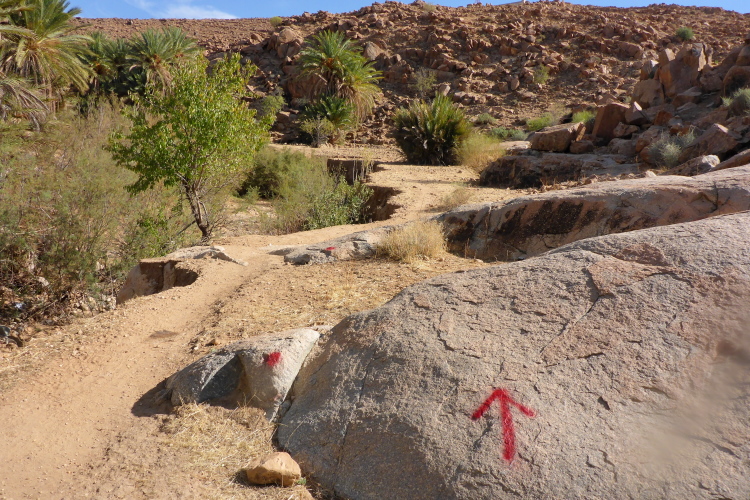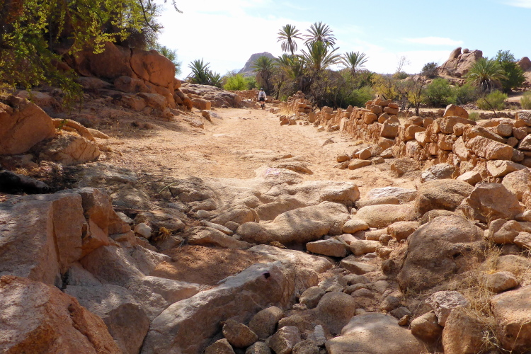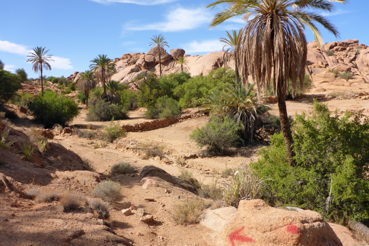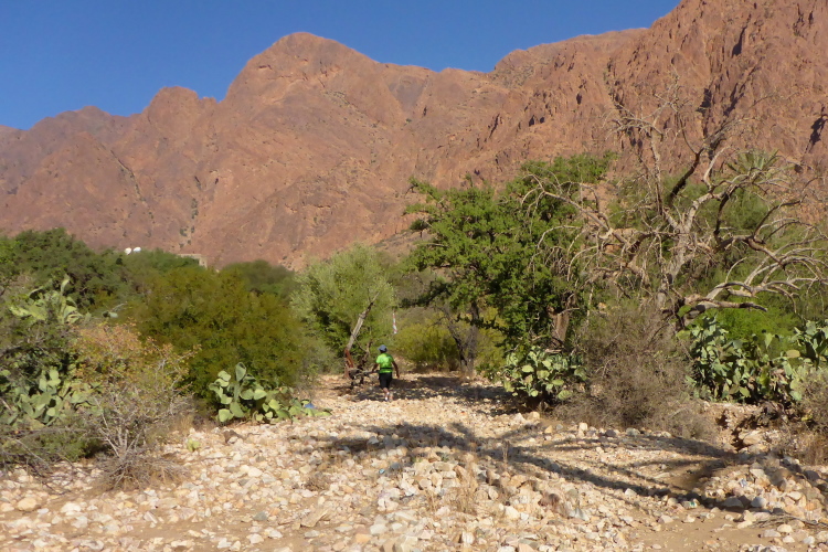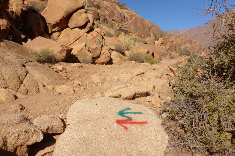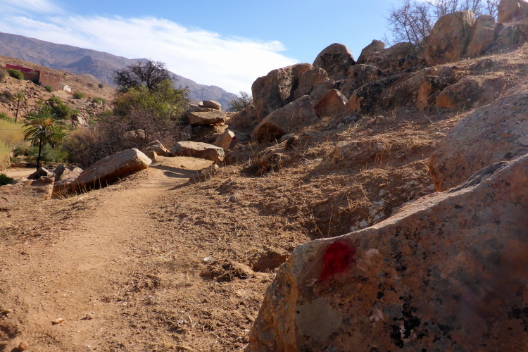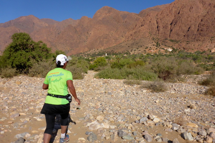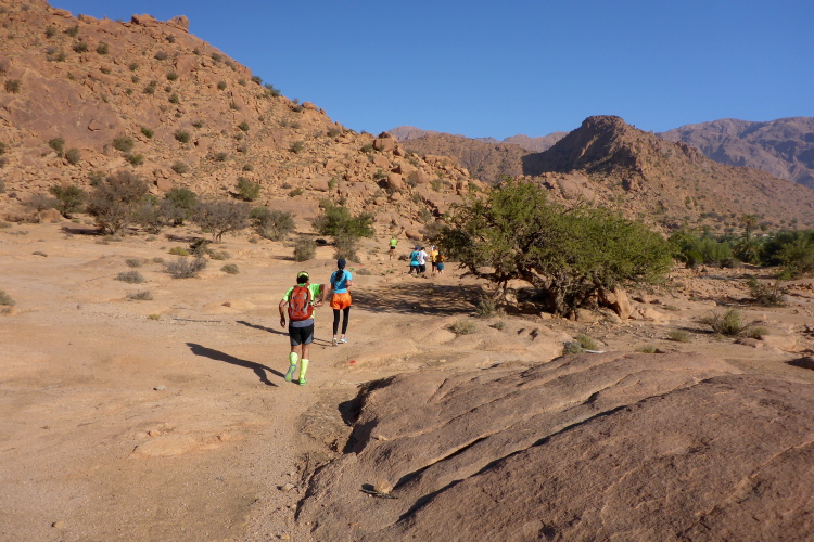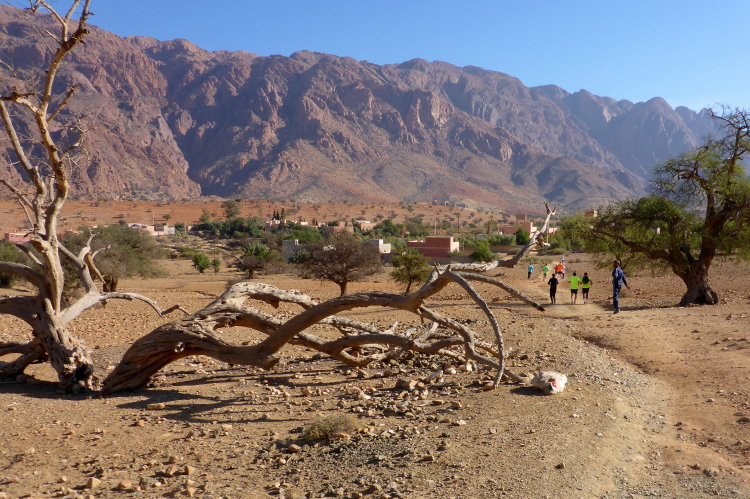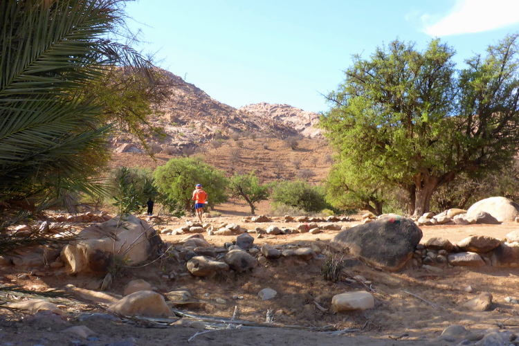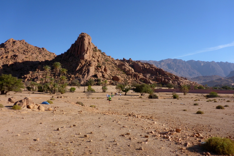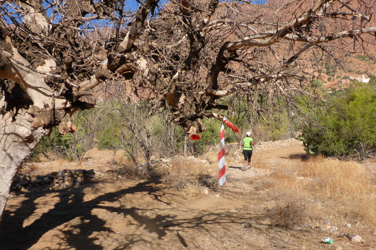 In Oumesnat ist die erste Wasserstation, bei Ighaln überqueren wir den Trockenfluss und biegen ab zurück nach Tafraout, um wieder auf die Afrikanische Platte zu steigen. Wie immer verlaufe ich mich hier. Ist ja nicht schlimm, brauche nur zu beobachten, wo die nachfolgenden Läufer langlaufen, dann habe ich wieder den Weg, über den wir 500 Meter Höhenunterschied bewältigen müssen.
