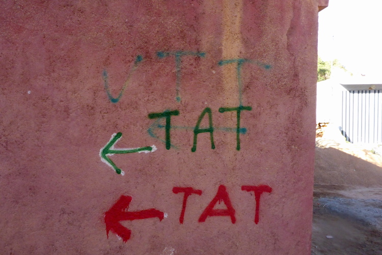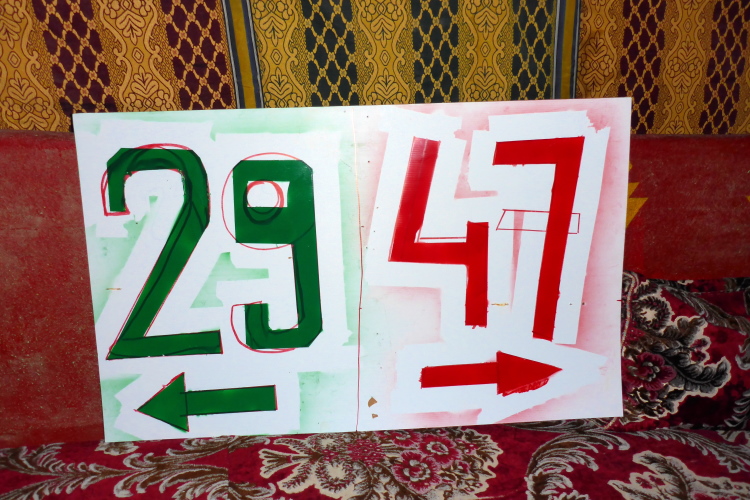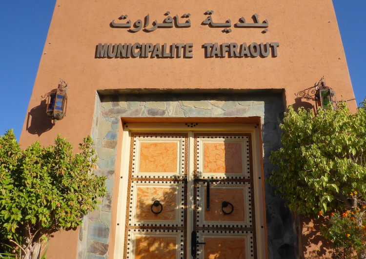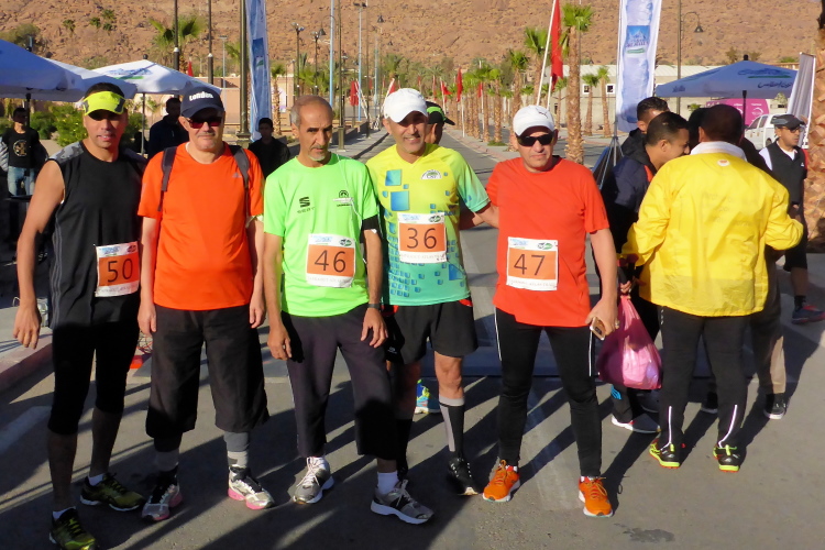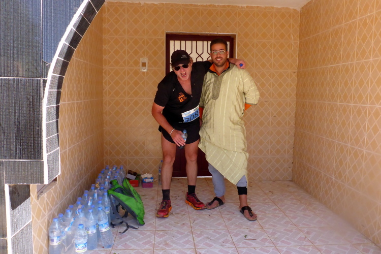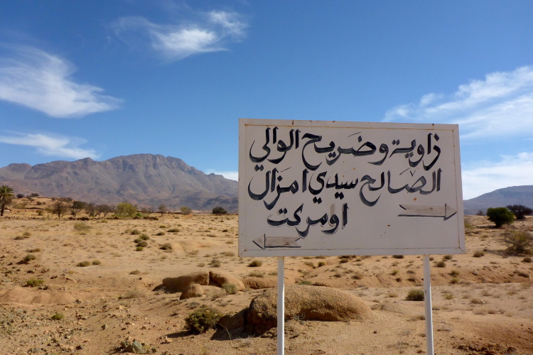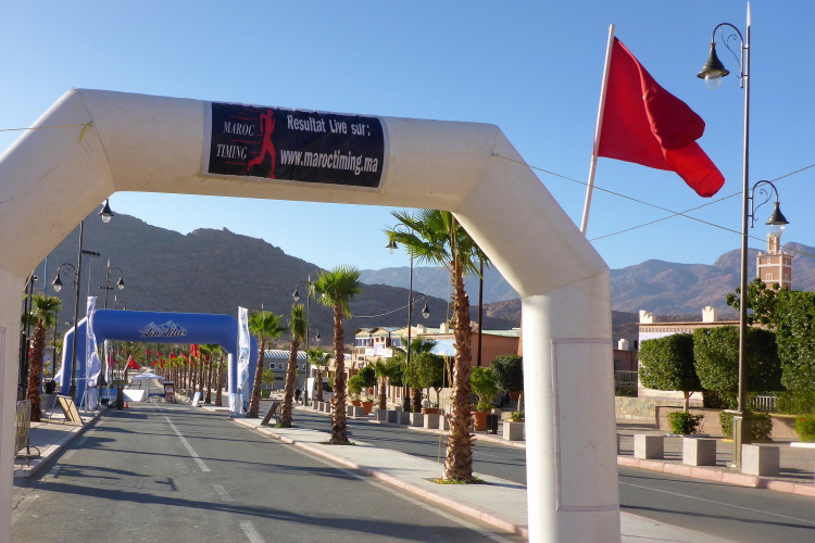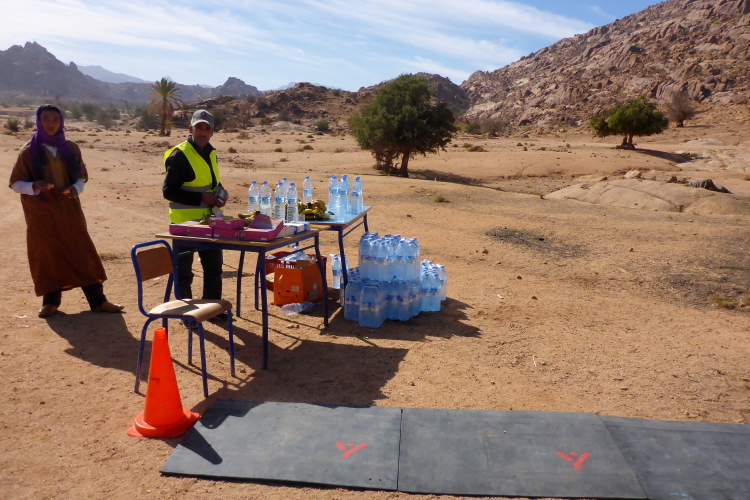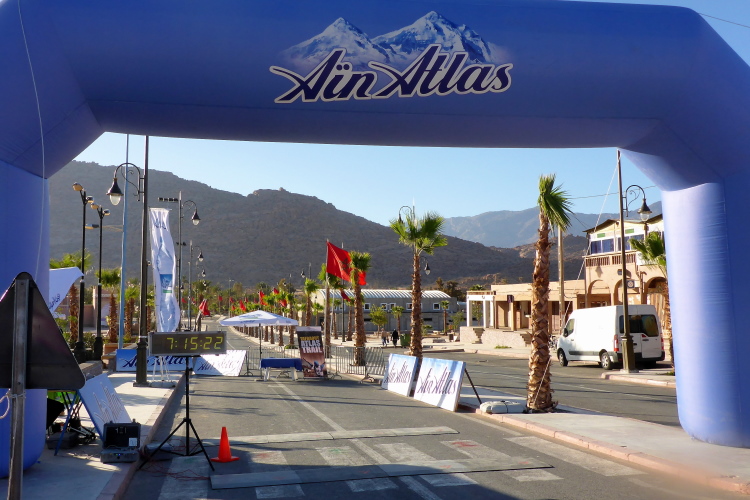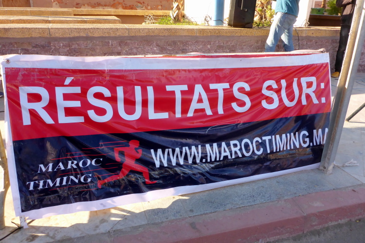 Bei Kilometer 32, versteckt in einem Gebäudeeingang, ist der nächste VP. Die zwei freundlichen Helfer am Verpflegungspunkt sprechen nur Tachelit, den hiesigen Berberdialekt. Deswegen braucht es lange, bis ich die Information habe, wie weit es noch bis zum Ziel ist. Erst seit Kurzem dürfen die Berber ihre Sprache in der Schule lernen. Erste Fremdsprache bleibt Arabisch, Französisch gibt es erst in der fortführenden Schule. Neuerdings darf auch die Berberschrift Tifinagh verwendet werden, man findet sie daher auf vielen Ortsschildern. Man kann in Tifinagh, das stark germanischen Runen ähnelt, keine Texte schreiben. Eine einheitliche Schriftweise für Orte, oder gar für die Sprache (Tachelit/Tashelhiyt) setzt sich erst allmählich durch. Bei Ortsnamen setzt sich die Schreibweise durch, die die Buslinien verwenden.