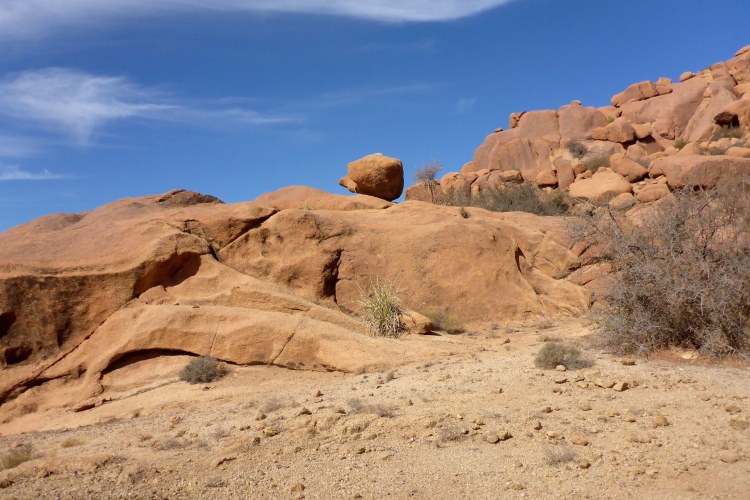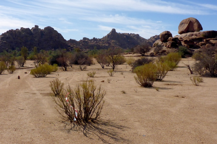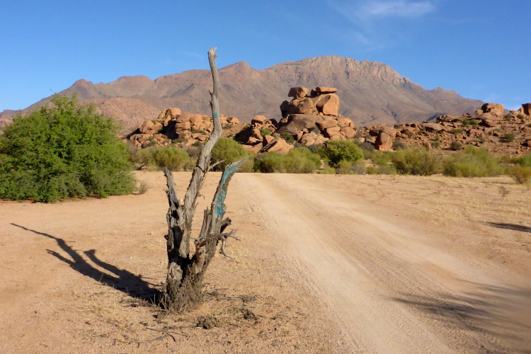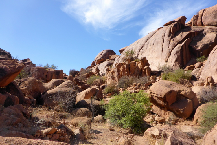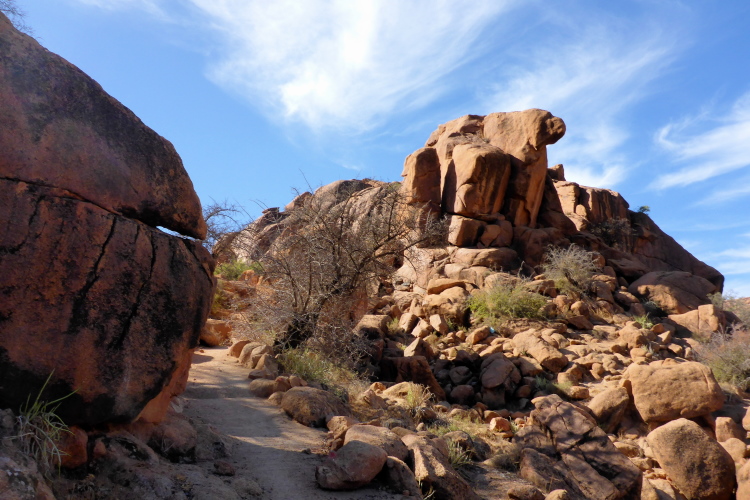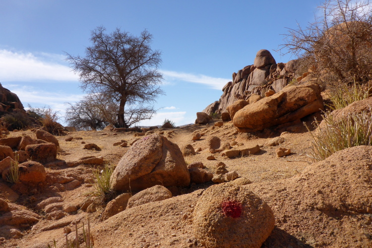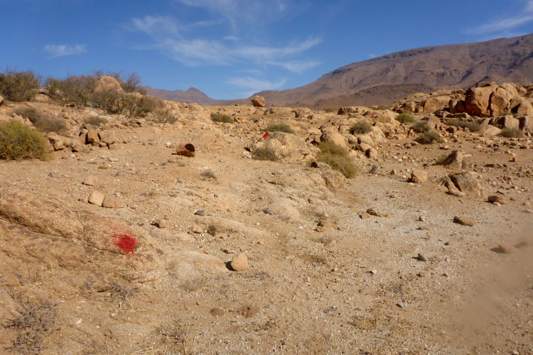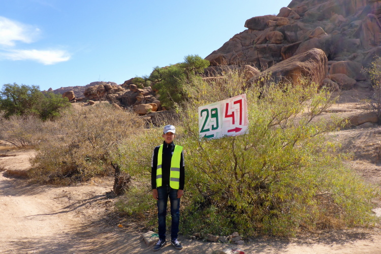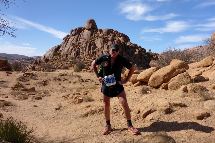 Der Zweite VP ist ausgerechnet da, wo gerade eine Bohrung nach Bodenschätzen durchgeführt wird. Früher sind wir über den Platz der modernen Nomaden gelaufen, dem Campingplatz, einem der schönsten der Welt. Dieses Jahr geht es oben entlang, wo die seltenen Regenfälle eine Achterbahn in die Felsenlandschaft gefräst haben. Das ständige Auf und Ab macht Spaß. Der Untergrund besteht aus zerbröseltem Granit. Wenn allerdings Brösel in meinem Schuh landen, dann geben Brösel keine Gnade. Jeder Brösel bröselt vor sich hin und dröselt sich ein.