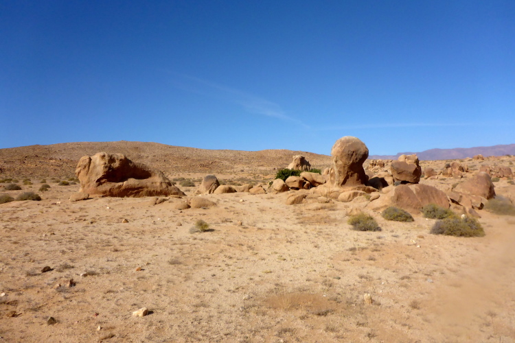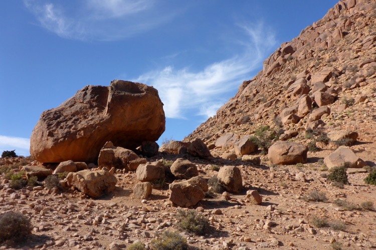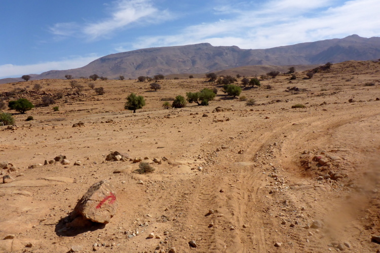 Dann jedoch folgt ein umgedrehter Teller aus Steinwüste, mit einem Durchmesser von 10 Kilometern. Die Markierung ist hervorragend, wäre auch für Harald Lange sichtbar. Auf den erhobenen Felsen sitzen die witzigen Fahlbürzel, wie die Finken auf Deutsch genannt werden. Sehr viel interessanter sind die Wüstenläuferlerchen, die kleinen Rennkuckucken gleichen und vor mir wegflitzen. Wüstentrappen habe ich letzte Woche gesehen, die werden von Touristen von der arabischen Halbinsel mit Falken gejagt. Marokko ist auf diese Leute angewiesen, die auch die zierlichen Cuvier-Gazellen erlegen. Rund um Tafraout gibt es geschätzt 500 Cuvier-Gazellen.