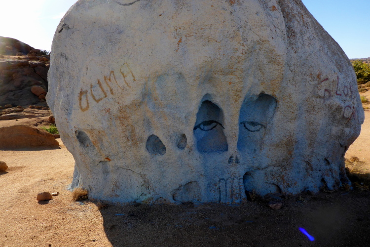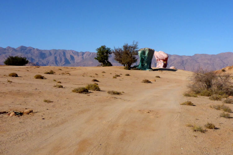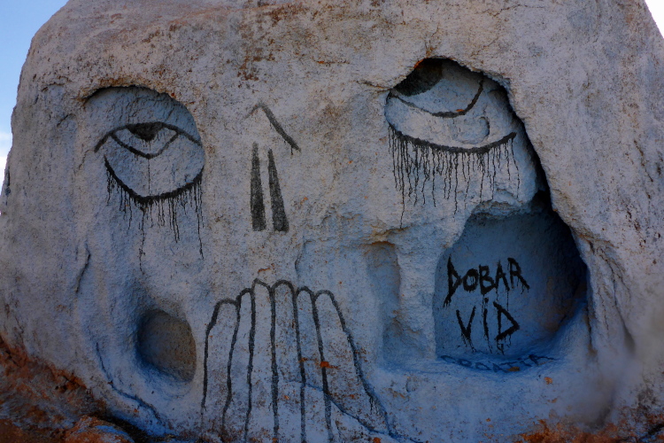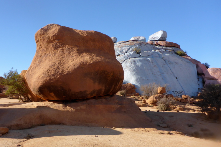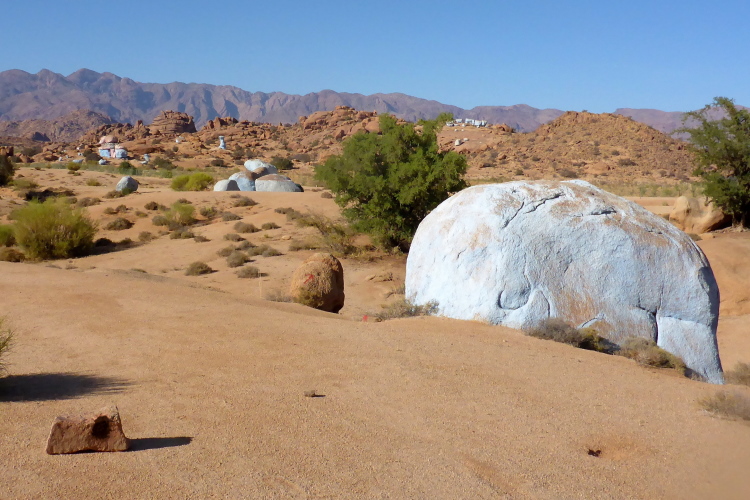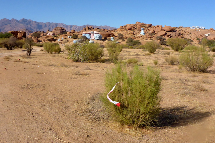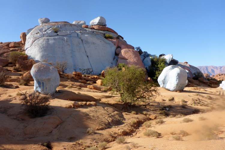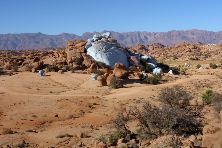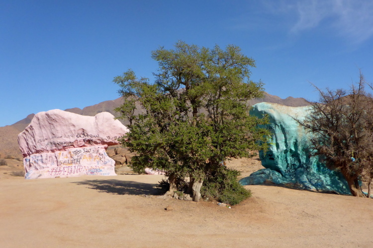 Die Farbe, mit denen ein Künstler in den 70ern die Felsen hellblau und rosa angemalt hat, wurde jetzt neu aufgetragen. Ist nicht unbedingt unser Geschmack, aber die marokkanischen Touristen lieben diese Farbspielereien. Heute am Nationalfeiertag sitzen viele im Schatten der Akazien, machen Picknick, hinterlassen keine Fußspuren aber leere Sardinendosen und hellblaue Plastikflaschen, die sich wunderbar zwischen die hellblauen Granitsteine einfügen.