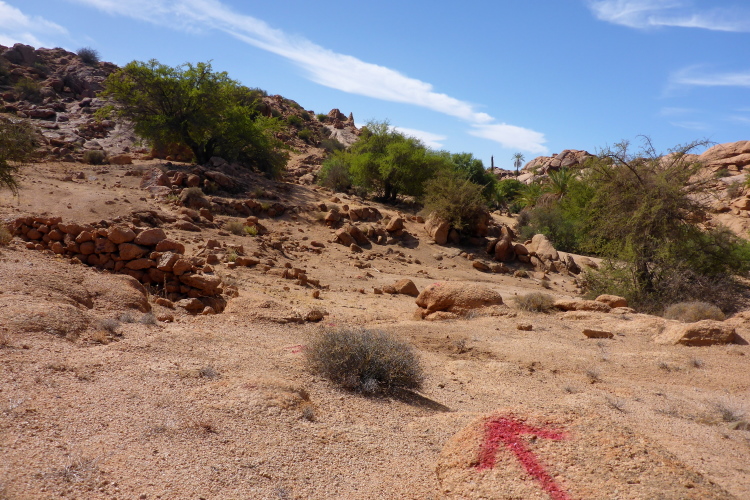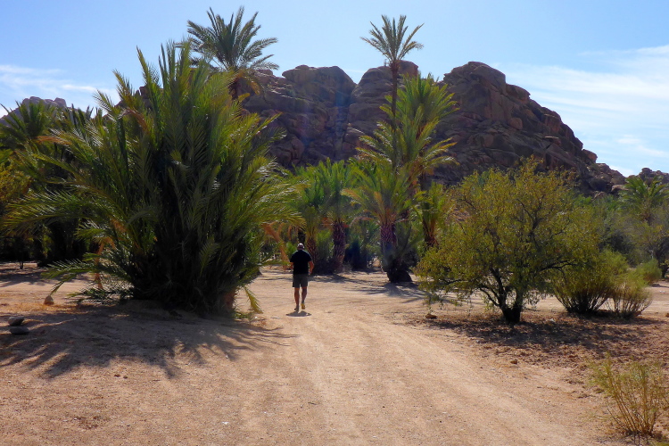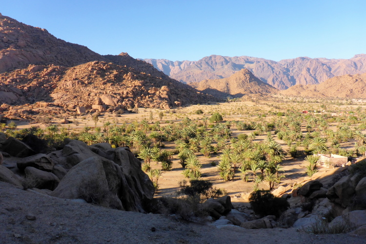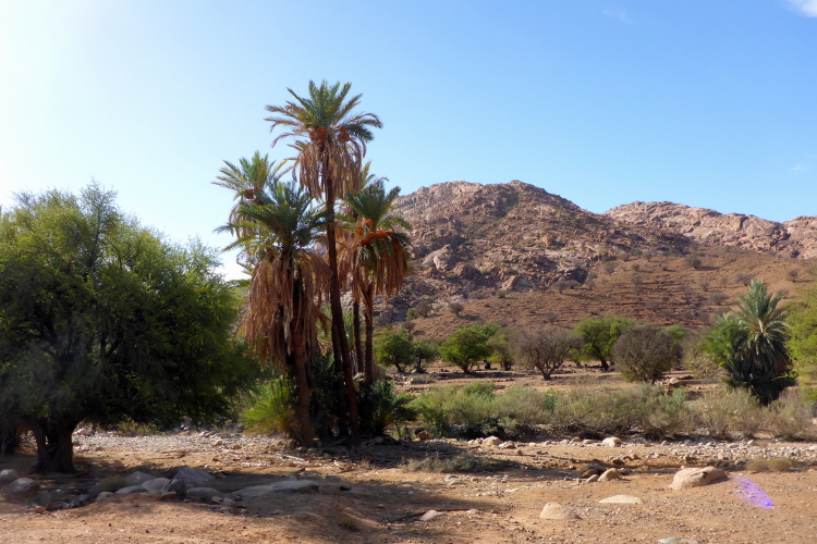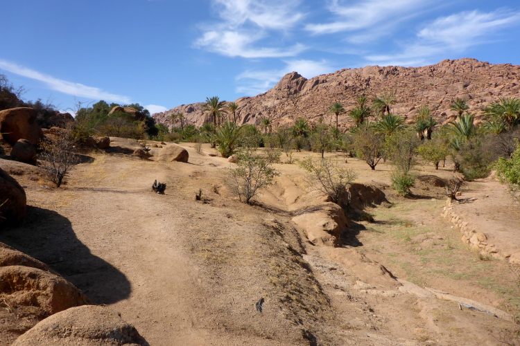 An einem bis auf die Grundmauern zusammengefallenen Farmgebäude klappert einen Brunnengestell, als wäre ich in einem Italowestern. Ein paar stolze Palmen strotzen der Trockenheit, dann kämpfe ich mich durch Feigenkakteen. Kakteen sind keine Afrikaner, sondern Amerikaner. Die Feigenkakteen wurden hier vor 200 Jahren angebaut, nicht um die Früchte zu essen. Es gibt dann noch Anis- Absinth- und Dattelschnaps. Das Selbstbrennen ist natürlich verboten.
