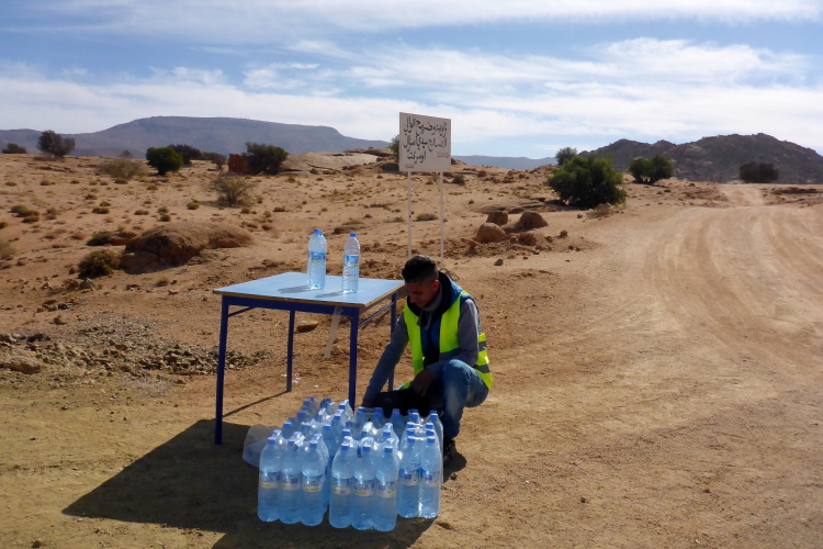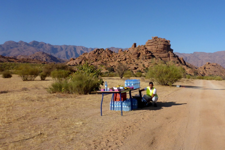Tatsächlich geht es pünktlich um 9 Uhr los, schließlich brauchen wir dieses Jahr nicht auf den Gouverneur von Tisnit zu warten. Da Schusswaffen in Marokko verboten sind, schickt uns Lahcen mit einer Gas-Tröte auf die 47 Kilometer Strecke.