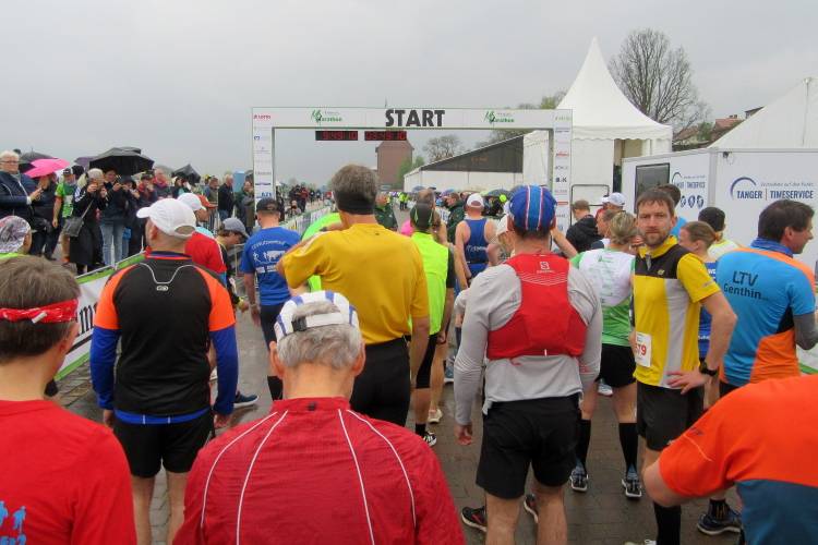 Also: Morgens aufgrund von luftigen Laufsachen nass werden und frieren, um am Nachmittag die aufgetragene Sonnencreme zu nutzen, oder am Morgen warm anziehen und wegen des bedeckten Körpers keine Sonnencreme benötigen, dafür aber zum Schluss mal richtig am Deich schwitzen. Da die warme Zeit genau in die zweite Runde fallen wird, entscheide ich mich für Variante eins. Warm wird einem beim Laufen sowieso und der meiste Regen fällt eh vorbei. So kommt es übrigens auch beim Elbdeichmarathon