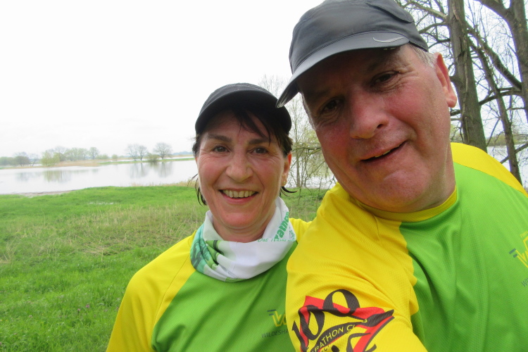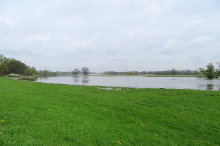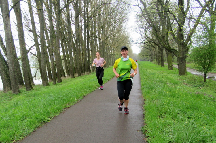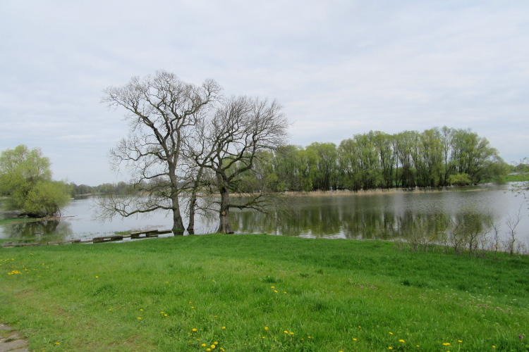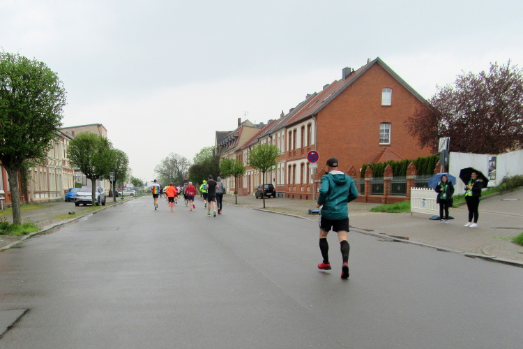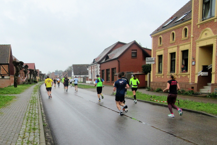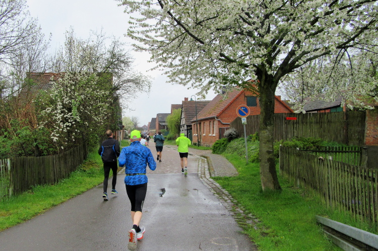 Der Blick in die Weite, teils die überfluteten Felder, teils die gelben Farbtupfer vom Löwenzahn. Das fette Grün, die ausschlagenden Bäume, die blühenden Kirschbäum im Dorfeingang. Dazu der Specht, irgendwo im Gehölz. Die Störche auf Ihren Nestern, Greifvögel, Wildgänse und anderes, piepsendes Federvieh. Einfach Laufen und Abschalten. Meter um Meter die Strecke genießen. In den Dörfern die kleinen und großen Anfeuerungen mitnehmen. Und immer die Elbe im Blick, mal weiter weg, mal dichter dran. Aber immer im Blick, ohne nasse Laufschuhe zu bekommen.