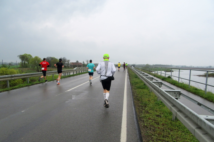 Marathon ist Ausdauersport und so kommt, was kommen muss. Die größeren Herausforderungen an die Fitness kommen auf der zweiten Runde. Die Wärme bei sonnigen 20 Grad, die Einsamkeit als Läufer, die Tatsache, dass Marathon auch Anstrengung und eben Herausforderung ist. Puls kontrollieren. Schritt um Schritt durch die Kilometer, weiter immer weiter. Ab km 25 beginnt beim Elbdeichmarathon der Punkt, wo Marathon zur Arbeit wird. Der persönliche Kampf gegen die Uhr, denn weitere Läufer sind eher in der Ferne zu erahnen als im direkten Umfeld. Das Alleinesein und sich immer wieder selber voran zu treiben, macht aber auch den Kopf frei…
