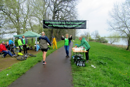 Naja, genau genommen ist nur „fast“ keiner da. Denn die Streckenposten und Versorgungspunkte beim Elbdeichmarathon sind wirklich klasse. In den Dörfern ist in diesen Bereichen Fete angesagt. Auf der Strecke ist man nie komplett alleine, sollte mal was passieren. Und Stimmung wird an den Versorgungspunkten in der weiten Elbniederung oder auf dem Elbdeich auch gemacht. Die Mädels sind super drauf und die Triathleten am Versorgungspunkt auf dem Deich haben, wie immer, Eye of he tiger für jeden Marathoni dabei. Dazu die tolle Moderation von Thomas im Start/Zielbereich. Danke für diesen tollen Support!