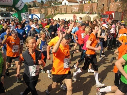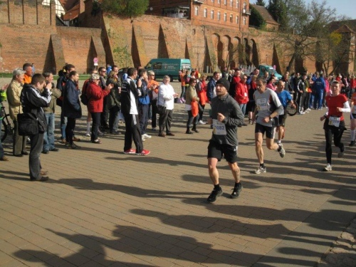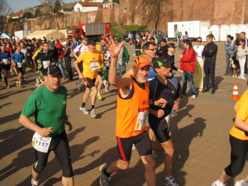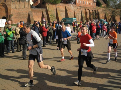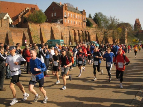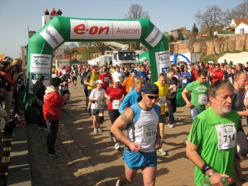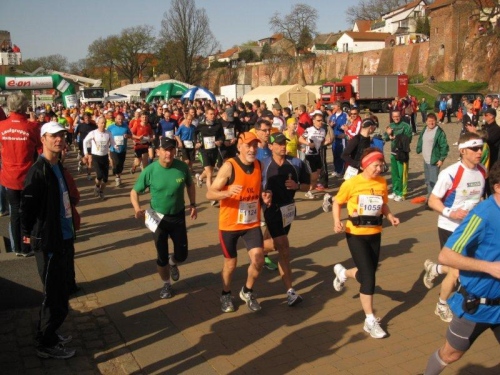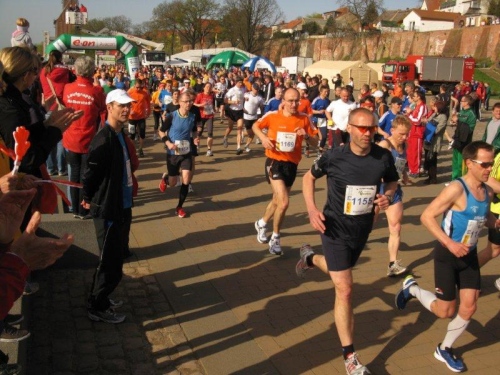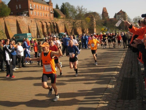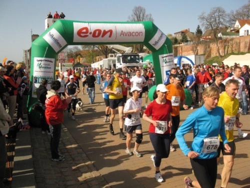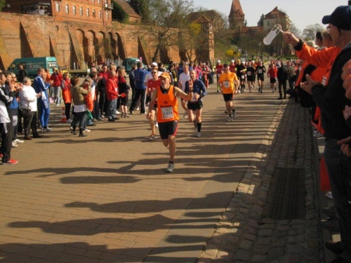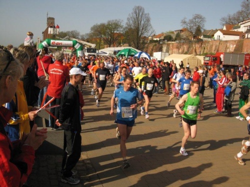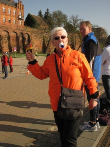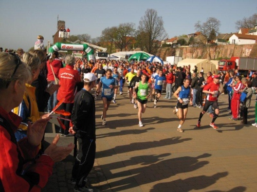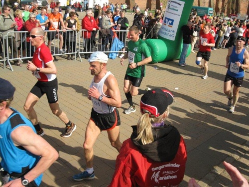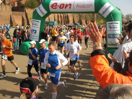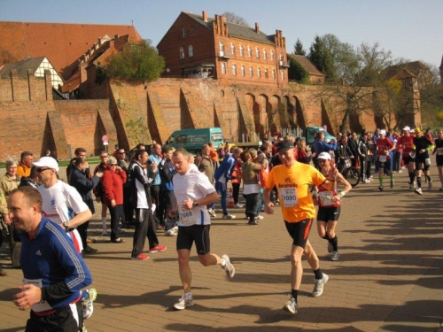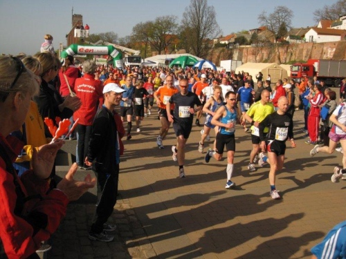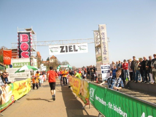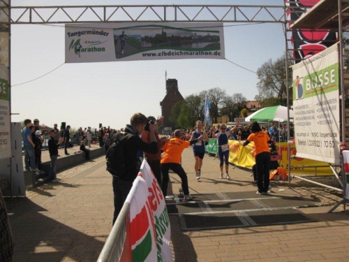 Am Horizont zeichnet sich schon das romantische Stadtpanorama von Tangermünde ab und bald kann ich wieder auf die Hafenpromenade abbiegen. Der letzte Kilometer wird wie immer leichter und die Zuschauerreihen dichter. Dann sehe ich schon den Zielbogen und die orangefarbenen Trikots der Bergheide Fans. Nach 4:05:01 überlaufe ich die Ziellinie und ein Mädchen überreicht mir noch eine schöne Medaille mit dem Tangermünder Rathaus als Motiv. Damit habe ich heute Platz 2 in meiner Altersklasse erreicht.
