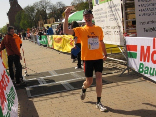 Der VfL Bergheide ist schon mit einem Vorbericht auf der Homepage des Marathonveranstalters bekannt geworden, und durch die einheitlichen Trikots gut zu erkennen. Wir bleiben im Zielgelände und feiern noch alle Finisher. Im nahegelegenen Sportzentrum kann man sich duschen und umziehen.