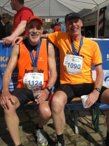 Inge hat alles fotografisch festgehalten und gratuliert mir zum mittlerweile 80sten Marathonlauf. Auch meine Vereinsfreunde sind da und freuen sich mit uns. Die Bergheide Läufer haben alle das Ziel gut erreicht und wir können etliche Podiumsplätze feiern.