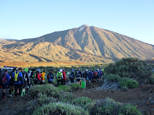 Als ich um die Kurve laufe, verschlägt es mir fast den Atem: ich sehe den schneebedeckten Gipfel des Teide, der mit seinen 3.718 Metern der höchste Berg Spaniens ist. Imposant, ja fast majestätisch, steht er da. Der Teide, im gleichnamigen Nationalpark gelegen, ist eines der Wahrzeichen Teneriffas und stellt gleichzeitig einer der Höhepunkte bei diesem Rennen dar. Dabei hat der Bluetrail gerade erst begonnen. Die Umgebung hier oben auf über 2.500 Metern Höhe präsentiert sich, fast ohne Vegetation, als wahre Mondlandschaft. Vorbei an futuristisch wirkenden Steinen und durch knirschenden Sand passiere ich den Checkpoint Montana Blanca, der höchste Punkt des gesamten Laufs. Die Umgebung erinnert mich ein wenig an La Réunion, die Vulkaninsel im Indischen Ozean. Das rötlich schimmernde Gestein und die weiten Sandebenen bilden einen atemberaubenden Kontrast zum strahlend blauen Himmel. Keine einzige Wolke bedeckt ihn. Was für ein herrlicher Anblick! Von weitem kann man das tiefe Blau des Atlantischen Ozean erblicken. „Vom Meer bis zum Himmel“, so lautet der treffende Slogan dieser Laufveranstaltung. Das Auge läuft hier definitiv mit. Schon nach den ersten Kilometern kommt man als Läufer auf seine Kosten.