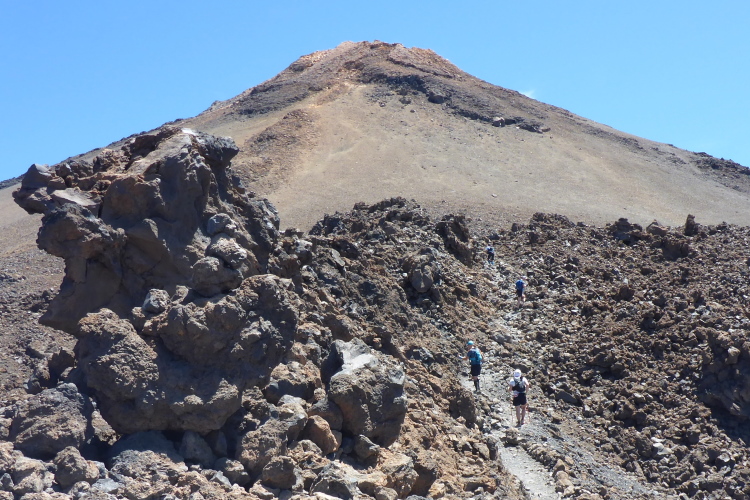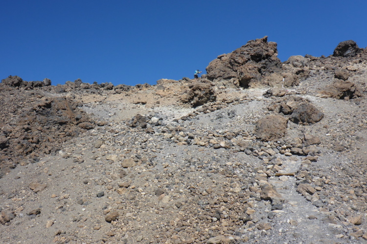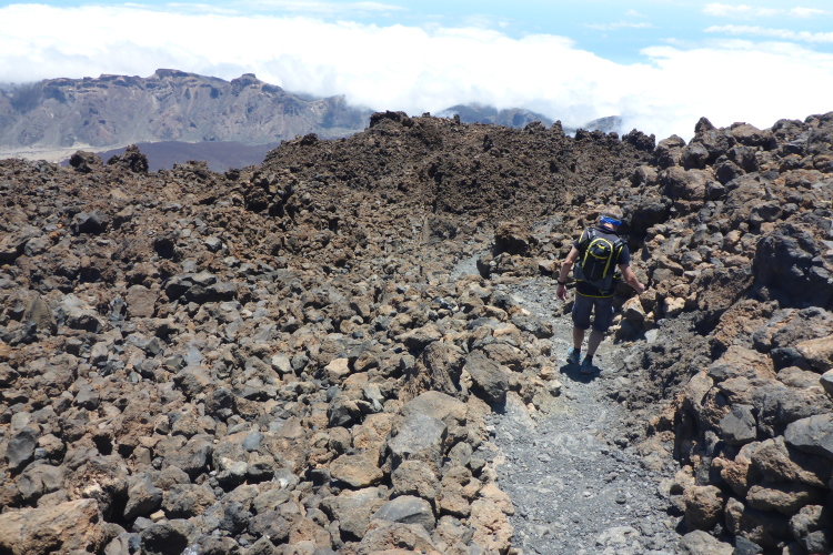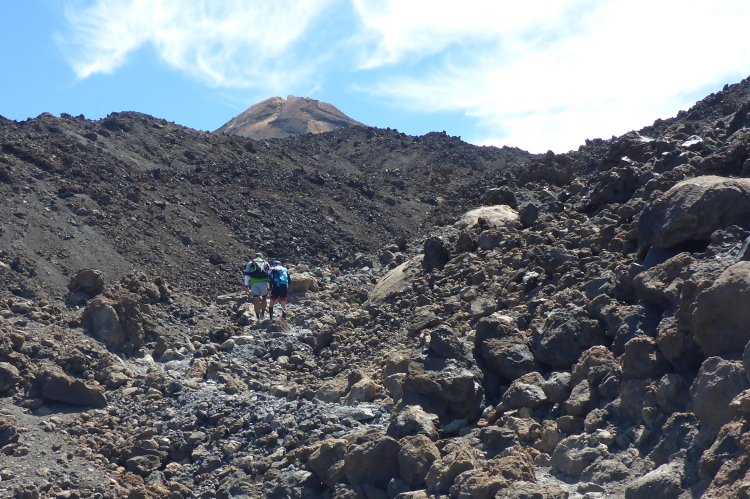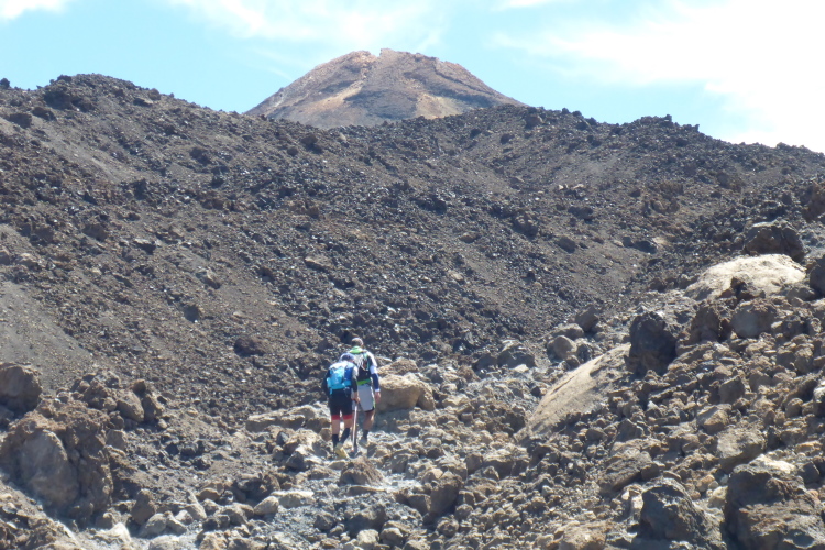 Mit großen Tritten und kleinen Schritten quäle ich mich durch das Felslabyrinth den Berg hoch. Die Lava ist zum Anfassen fast zu scharfkantig. Ich versuche bewusst schnell zu atmen, muss aber immer wieder ausruhen. Der Puls geht zwar nicht sonderlich hoch, aber er klopft mächtig in den Schläfen. Stöcke dürfen im gesamten Nationalpark nicht benutzt werden. Hier wären sie nur hinderlich. Zu zerklüftet ist der Aufstieg und Balancieren geht einfacher ohne Stöcke. Wenn ich den Kopf beim Ruhen nach unten halte, wird es mir beim Aufblicken schwindlig. Ich will auch gar nicht hoch schauen, denn der Gipfel scheint noch zu weit weg. Okay, da will ich auch nicht hin, sondern nur auf die Bergstation der Seilbahn. Also Zähne zusammen beißen und wieder 20 Meter weiter.
