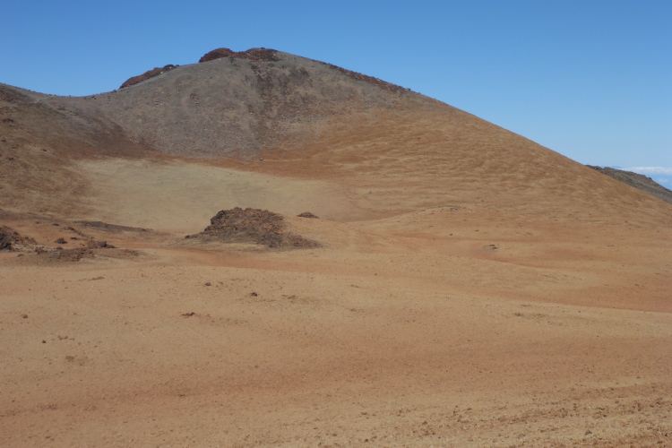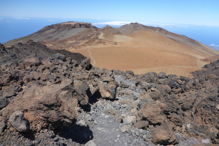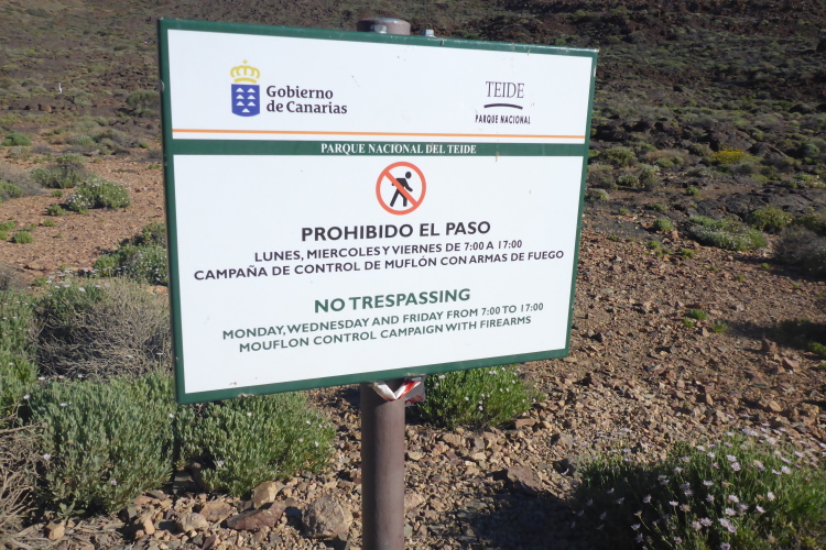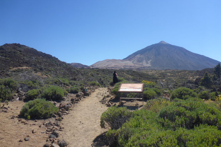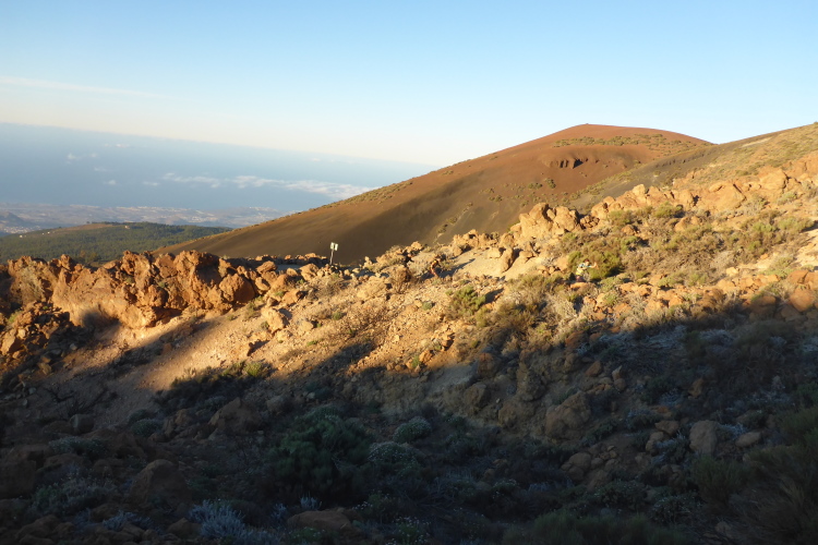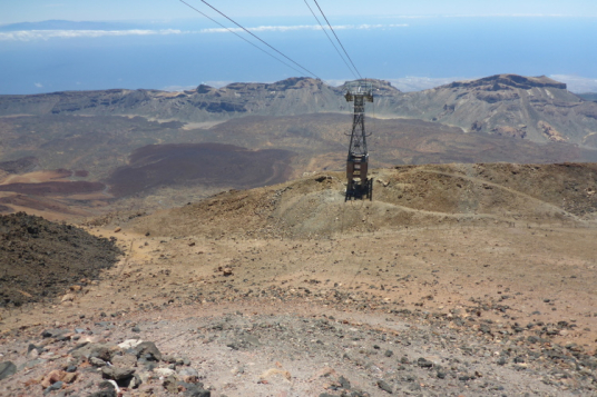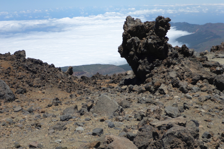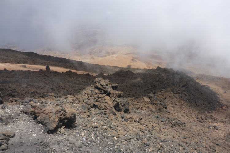 Langsam werden die Wolken zu einem luftigen Schleier und wir erreichen die Baumgrenze, wo jetzt ungetrübt die Sonne scheint. Wir erfreuen uns an der bizarren Vulkanlandschaft, die hier alle Spielarten von Stein, Sand, Geröll, Farben aber auch exotischen Pflanzen bereithält. Wir fahren mit der Seilbahn hoch zum Gipfel. Von dort sind es noch 200 Höhenmeter zum Krater. Für diesen Ausflug braucht es allerding ein Permit, das wegen der Kontingentierung schon Monate im Voraus gebucht werden muss. Wir belassen es bei einem kleinen Spaziergang. Das Flatterband für morgen zeigt uns schon in etwa den Streckenverlauf. Von hier oben kann man ja quasi die ganze Strecke überblicken. Nur der Norden, also der Heimweg macht mir Sorgen. Dunkle Wolken versperren die Sicht und beim Nachhause fahren regnet es heftig. An der Küste scheint dann wieder die Sonne, aber die Wolken sind doch sehr bedrohlich.