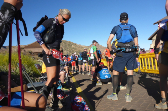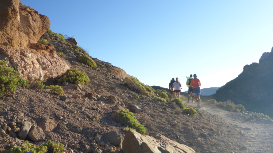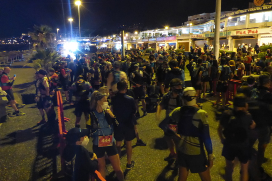 Freitag ist Raceday. Wir schlafen alle so lange es geht und der Tag wird mit Ein- und Auspacken des Rucksacks, Essen und Schlafen verbracht. Da wir quasi vier Vegetationszonen durchqueren, ist eine entsprechende Mindestausrüstung vorgeschrieben. Direkt vor dem Hotel geht dann abends um 9 auch der Shuttlebus. Beim Anblick der Wartenden kommen mir erste Zweifel, ob die Schweinehund-Challenge wirklich ausgereicht hat. Viele Spitzenläuferinnen und –Läufer haben sich versammelt. Auf der Ultrastrecke finden heute die spanischen Trail-Meisterschaften statt. Die spanischen Oberschenkel sprechen eine deutliche Sprache, aber zum Kneifen ist es jetzt zu spät. Mein Plan ist recht einfach: so lange es geht, so schnell laufen wie ich kann. Dann wird das schon klappen.