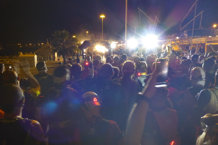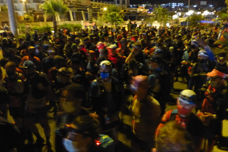 Der Start ist ganz im Süden der Insel, am Strand von Adeje. Nach bequemer Busfahrt feuern uns die Partygäste am Zuweg zum Start an. Schnell noch das Dropbag abgeben und wir stehen schon im Startkanal. Zuerst startet die Elite, danach geht es in Wellen weiter. Bei allen wird beim Zutritt die Temperatur gemessen. Mit nur einem Messgerät, das nicht so richtig funktioniert, tut mir das Mädel wirklich leid, aber irgendwie klappt es und tres, dos, uno geht es auch los. Es werden noch links und rechts ein paar Raketen gezündet und schon bin ich unterwegs.