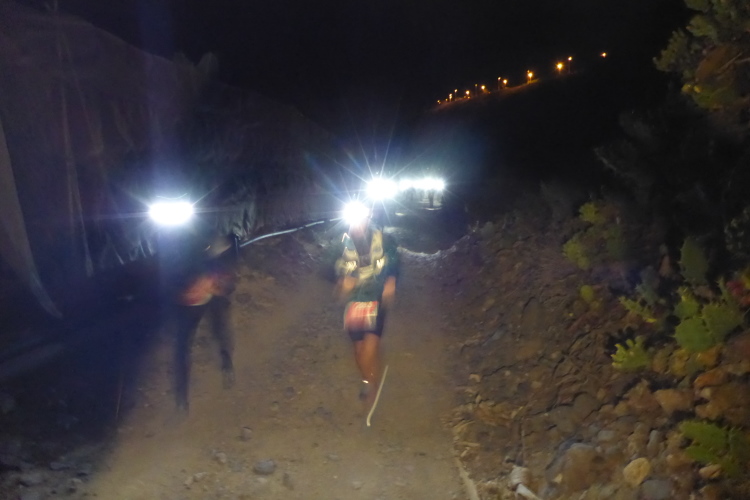 Es ist kurz nach Mitternacht und ich fühle mich sehr gut. Erst geht es ein oder zwei Kilometer über den Sandstrand, dann biegen wir ein in ein Kerbtal. Es staubt von den vielen Füßen, die vor mir die Strecke bearbeiten. Es ist wolkenlos und sehr warm. So etwa 25 Grad. Das erste Cutoff kommt schon nach 90 Minuten bei 8,5 Km auf der Plaza de Adeje. In den letzten Jahren sind dort immer schon einige ausgeschieden, was den kompetitiven Charakter der Veranstaltung unterstreicht. Geduldig warten hier die Laufenden, um ihre Flaschen auffüllen zu können. Es wird immer nur eine Person bedient. Das hält natürlich auf, aber ich will mich nicht beschweren. Mit lecker Iso und Wasser geht es weiter. Der eine Liter war bereits verbraucht. Ich schwitze wie ein Pferd.