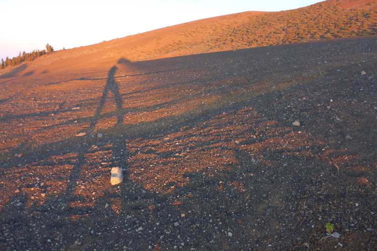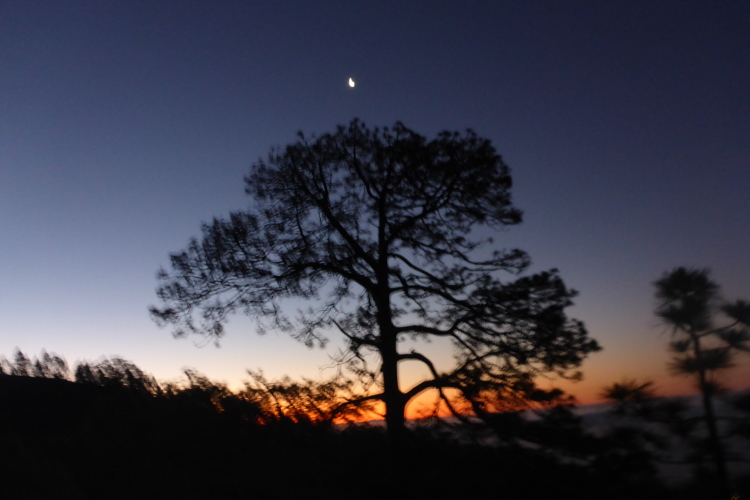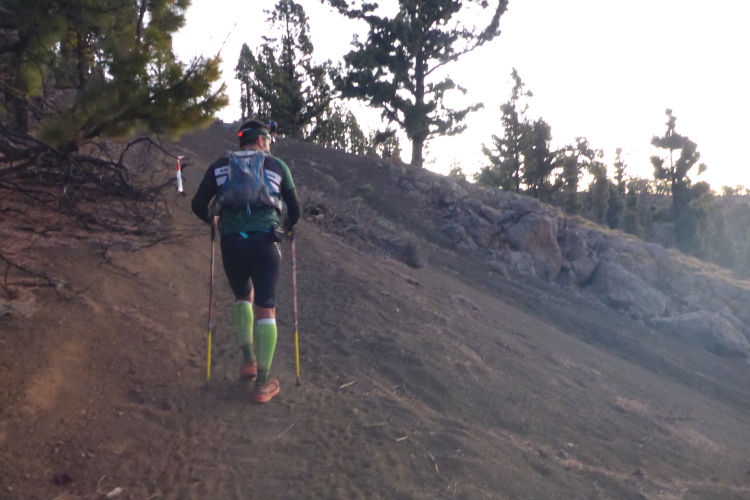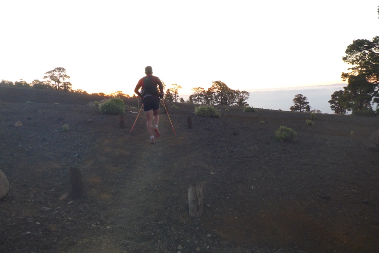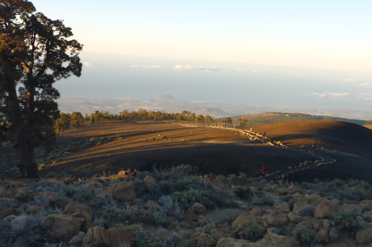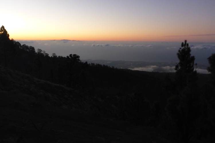 Ich setze mich kurz und stärke mich mit einem Stück Melone. Es ist 5 Uhr. Ich habe jetzt 45 Minuten auf das Cutoff und bin zufrieden. Ab Vilaflor wird es etwas ruppiger. Wir durchqueren die letzten Kiefernwälder vor der Baumgrenze. Der Weg führt vor allem über Asche. Es knirscht unter den Schuhen und das Vorankommen ist mühsam. Im Osten beginnt langsam die Dämmerung. Durch die Bäume blicke ich auf die Wolkendecke, die schon unter uns liegt. Schließlich zaubert die Sonne ein Farbspektakel von Lila über Rosa und Orange, bis sie dann endlich ihre Kraft vollends entfaltet. Schlagartig endet der Bewuchs und eine steile Rampe führt durch tiefe Asche einfach nach oben. Unter uns streben schon die Läuferinnen und Läufer der Trail Strecke den Berg hoch. An der Rampe werde ich von einer großen Gruppe überholt. Unfassbar für mich, wie man in diesem Tempo dort hochlaufen kann.