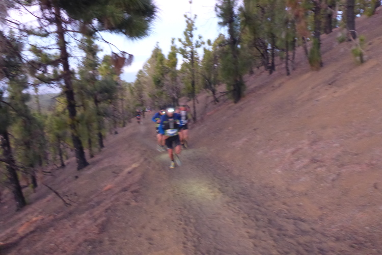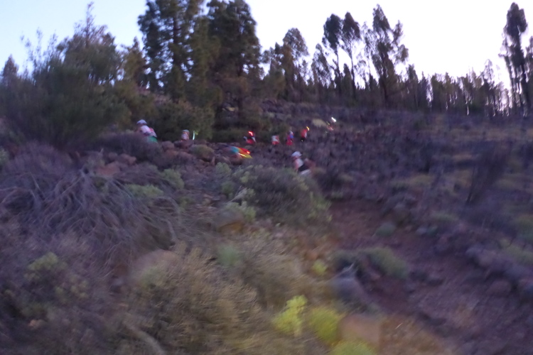 Jetzt kommt der erste lange Anstieg von etwa 500 Höhenmetern. Ich schieße ein paar Fotos aus der Hüfte, die aber allesamt nicht gelingen. Lange stehen bleiben, wie sonst, geht aber nicht. Das kostet zu viel Zeit. Ich sehe eine Lichterkette bis hinunter ins Tal. Es sind also noch ganz viele hinter mir. Das gibt mir ein gutes Gefühl. Bei der nächsten Allimentation habe ich schon gut eine halbe Stunde Vorsprung auf den Cutoff. Die Wege sind bis hier recht gut laufbar. Wir durchqueren Kiefernwälder und Abschnitte mit spärlichem Bewuchs. Ein Blick in die Gegend wird aber direkt mit einem Stolpern bestraft. Ich konzentriere mich voll auf die Strecke, um nicht zu stürzen. Zwei Suchscheinwerfer und die Klänge der Moderation kündigen den nächsten Verpflegungspunkt an. Dort startet um 6 Uhr mein Freund Swen auf die 74km-Strecke. Zu meiner Überraschung laufen wir den Punkt aber gar nicht an, sondern verpflegen uns an anderer Stelle auf der Plaza de Vilaflor.