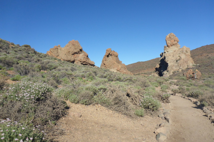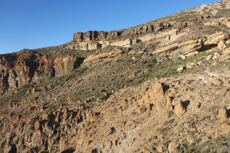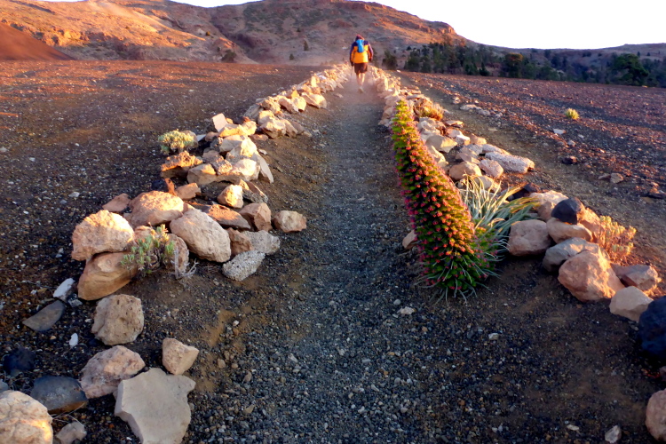 Ich wechsele an der Verpflegung die Schuhe und trinke ein Bier aus dem Dropbag. Das musste jetzt sein. Mit den 45 Minuten Vorsprung, die ich halten konnte, geht es an den Monsteraufstieg. Etwa 1500 Höhenmeter am Stück. Zuerst noch durch eine wildromantische Felsenlandschaft. Verschiedene Vulkan- und Lavakegel geben der Landschaft ein bizarres Bild wie in einem Western. Ein guter Weg windet sich beharrlich nach oben. Auf hellem Boden schrauben wir uns in die Höhe. Am Wegesrand oft der Wildprets Natternkopf, eine imposante Pflanze, die nur hier und auf La Palma vorkommt.