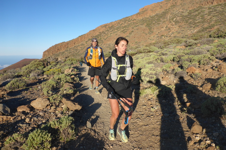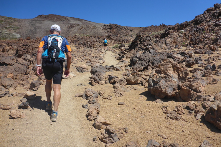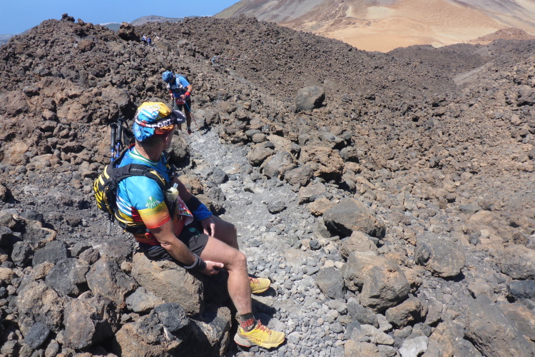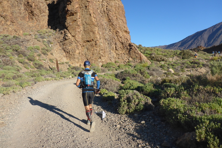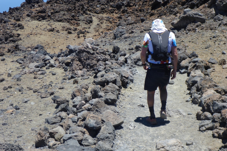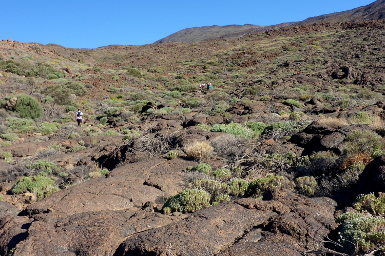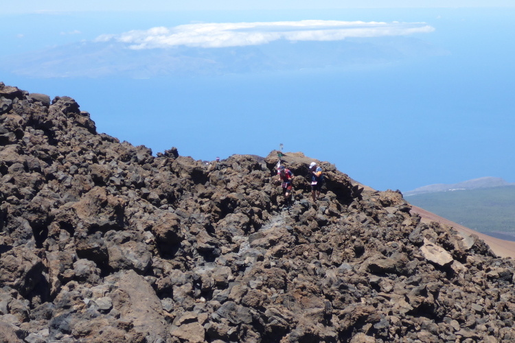 Der Teide liegt wolkenlos vor mir. Die Luft wird kühl und, wie ich jetzt schon merke, auch dünn. Läuft man in den Alpen in großer Höhe, startet man ja meisten schon relativ hoch. Hier startet man aber auf genau Null. Das macht es aus meiner Sicht noch schwerer und der Unterschied ist ohne große Akklimatisation heftig. Mir geht es aber noch gut. Zumindest so lange wir auf den guten Trails unterwegs sind. Irgendwann hören diese aber abrupt auf und eine schwarze Lavazunge versperrt den Weg. Die Läuferinnen und Läufer scheinen ohne erkennbaren Pfad einfach darin zu verschwinden.