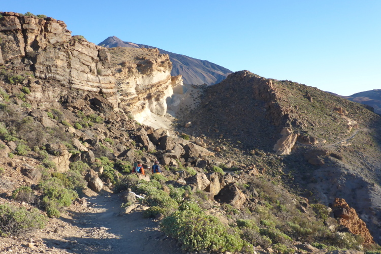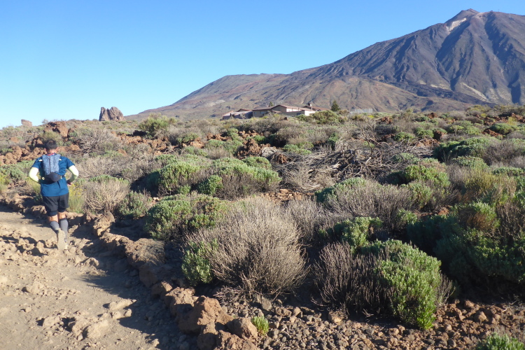Am Ende der Rampe liegt er dann zum ersten Mal vor uns: der Teide. Mit 3715 Metern der höchste Berg Spaniens. Ein Vulkan, wie aus dem Bilderbuch. Imposant thront er über der Insel. Mir macht er gerade etwas Angst, denn es sieht verdammt hoch und noch verdammt weit aus. Die Bergstation der Seilbahn, also unser höchster Punkt, ist gut zu erkennen. Aber ich lasse mich nicht einschüchtern. Ich bin gut trainiert. Ich bin mental stark und ich will das Ding bezwingen. Ich bin der Sturm! Aber Moment noch. Erst geht es mal wieder runter. Am Parador wartet mein Dropbag. Swen, der auf der 74km-Strecke ist, holt mich kurz davor ein. Meine beiden Laufkollegen Katja und Burkhard hat er schon vor ein paar Kilometern überholt. Sie sind leider nicht so fit und müssen Gas geben, um das Cutoff zu halten.