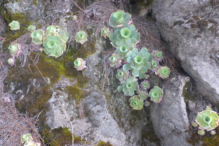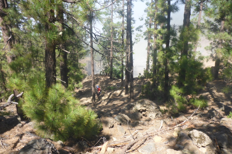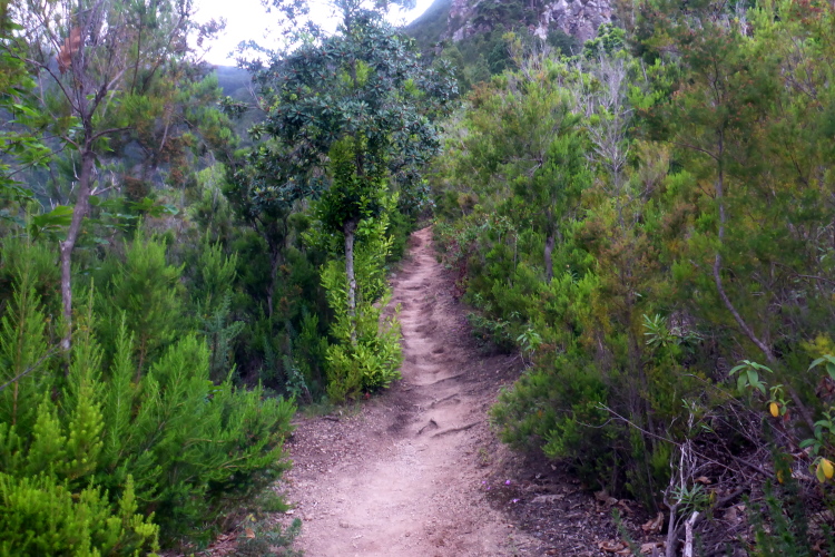 Wir laufen durch Kiefern- und Lorbeerwälder. An den Bäumen hängen nasse Flechten. In den Fugen der Felswände wachsen saftige Steinpflanzen. Überall sehe ich Blühendes im Nebel. Es sieht aus wie im Märchenwald. Die Strecke wird dagegen jetzt ruppiger. Schöne, gut zu laufende Downhills wechseln sich mit scharfen, steilen Rampen ab. Ich hasse es. 500m schön runter laufen und wieder 50m Rampe hoch. So geht es eine ganze Weile. Manchmal denke ich, ich laufe in einer Endlosschleife, den Blick nur auf den Boden gerichtet. Rutschig ist es jetzt und nass. Besonders an den vielen Holzstufen ist Vorsicht geboten. Ein Ausrutscher verläuft glimpflich. Das war Glück.