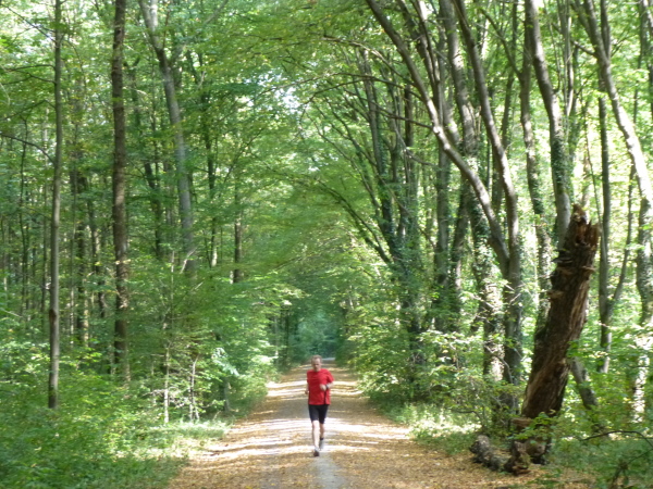 Einen guten Gradmesser für den eigenen Trainingszustand bieten die beiden Anstiege gleich zu Beginn der nächsten und übernächsten Runde. Geht es noch so locker wie auf der ersten Runde oder fühlen sich die Beine schon schwerer an? Das Läuferfeld hat sich jedenfalls kräftig auseinander gezogen. Jeder kann sein Tempo laufen. Und das ist bei vielen ziemlich hoch. Es ist eigentlich erstaunlich. Obwohl der Kurs in keiner Weise "PB-tauglich" ist, sind viele ambitionierte Vereinsläufer am Start und es werden an der Spitze Zielzeiten von unter 35 Minuten erreicht. Der Durchschnitt liegt unter 50 Minuten. Aber vielleicht es auch einfach nur das Gefühl, eins mit der prallen Natur zu sein, was besonders motiviert.