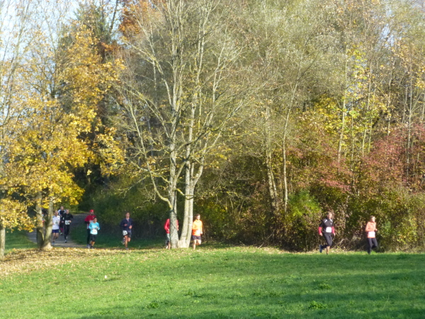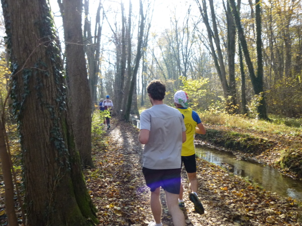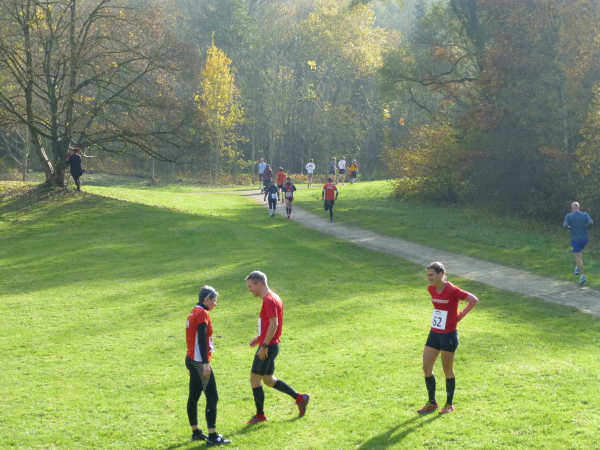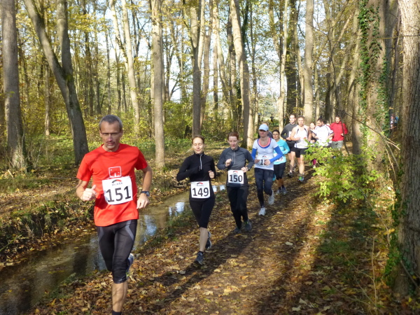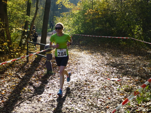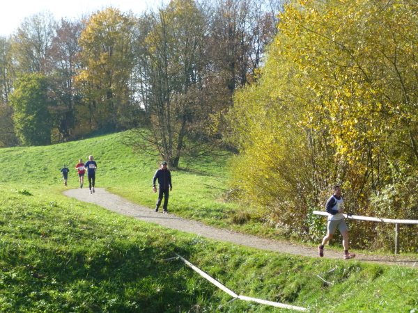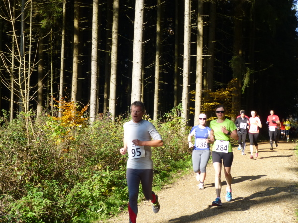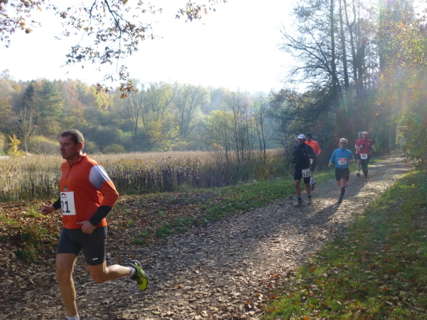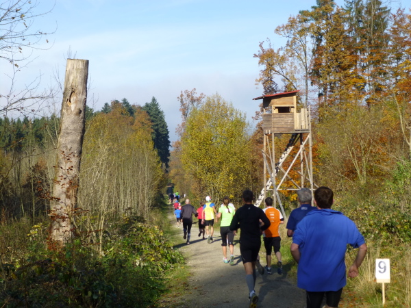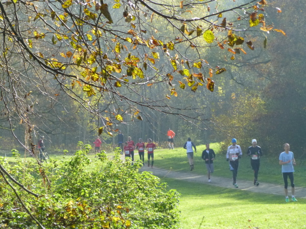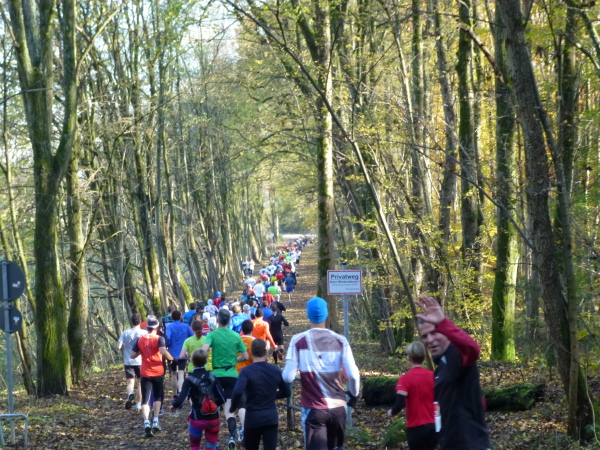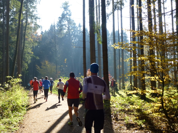Ein wenig eng ist es hier auf der ersten Runde, da das Läuferfeld noch dicht ist. Aber es macht Sinn, das Wegstück entspannt anzugehen, denn nach dieser Verschnaufpause steht uns sogleich Konditionsprüfung Nummer zwei bevor. Knapp 25 Höhenmeter sind es dieses Mal, nur jetzt nicht mehr steil, sondern auf einem breiteren Naturweg gleichmäßig über etwa 300 Meter verteilt. Aber die haben es in sich, wie das schweigende Schnaufen, übertönt nur vom Rascheln des trockenen Laubteppichs, um mich herum belegt. In einem sich sanft durch herbstlich lichten Laubwald schlängelnden Wegstück läuft der Anstieg aus.