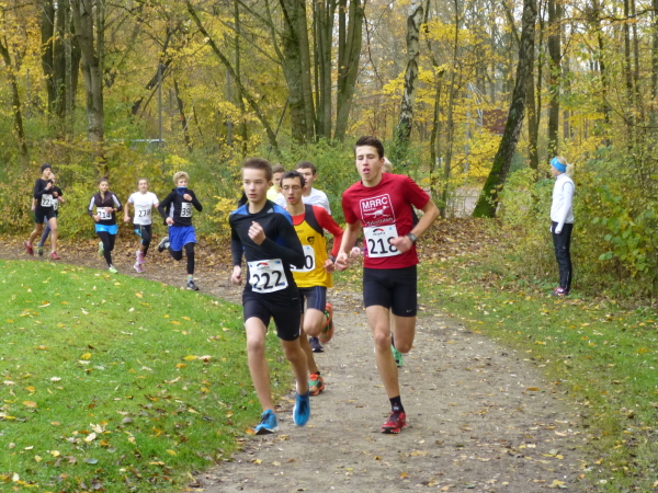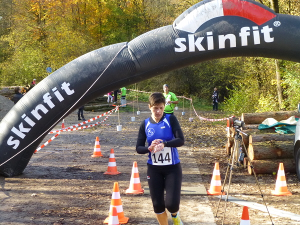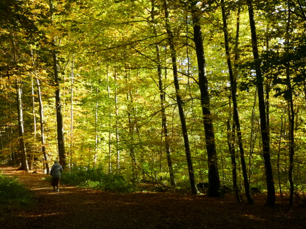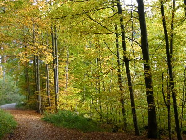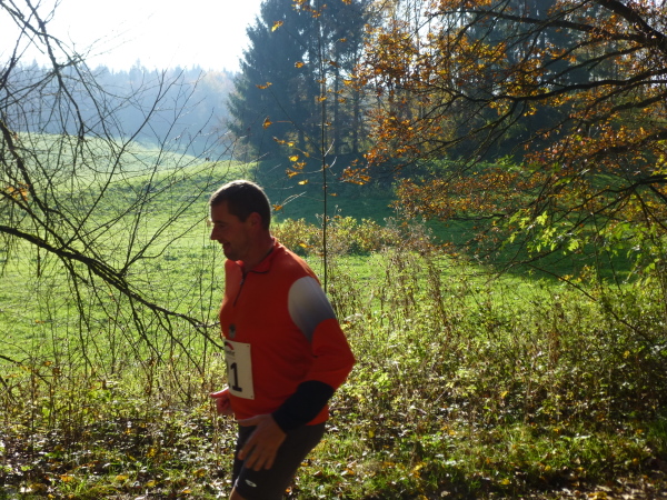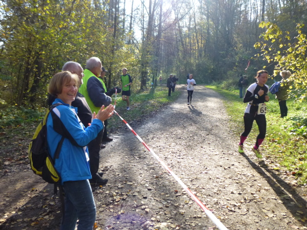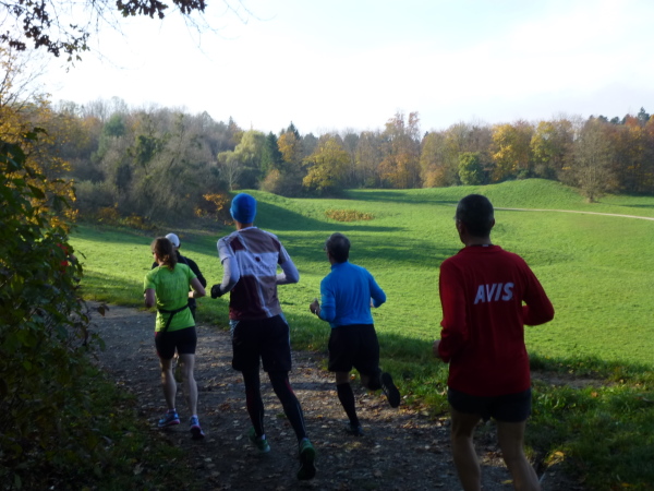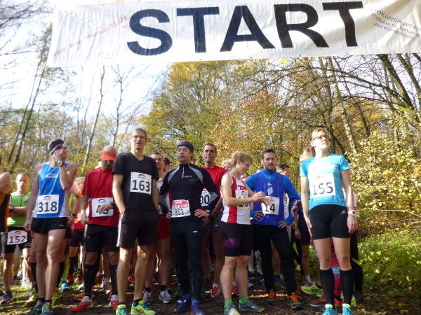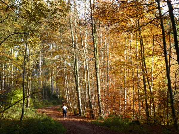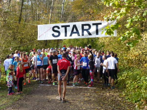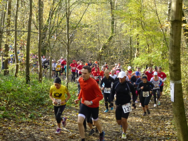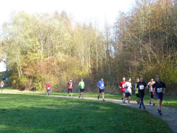 Ein wenig eng ist es hier auf der ersten Runde, da das Läuferfeld noch dicht ist. Aber es macht Sinn, das Wegstück entspannt anzugehen, denn nach dieser Verschnaufpause steht uns sogleich Konditionsprüfung Nummer zwei bevor. Knapp 25 Höhenmeter sind es dieses Mal, nur jetzt nicht mehr steil, sondern auf einem breiteren Naturweg gleichmäßig über etwa 300 Meter verteilt. Aber die haben es in sich, wie das schweigende Schnaufen, übertönt nur vom Rascheln des trockenen Laubteppichs, um mich herum belegt. In einem sich sanft durch herbstlich lichten Laubwald schlängelnden Wegstück läuft der Anstieg aus.