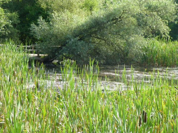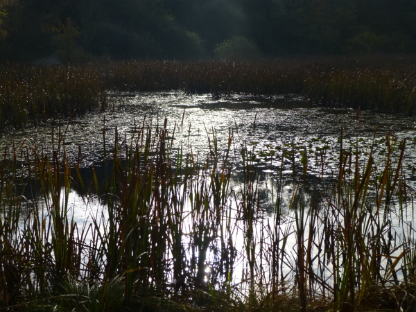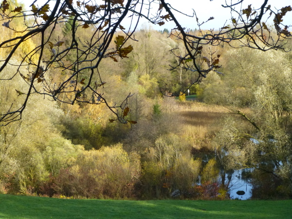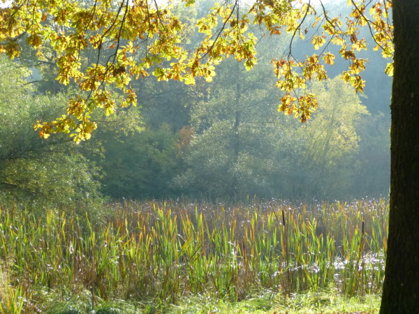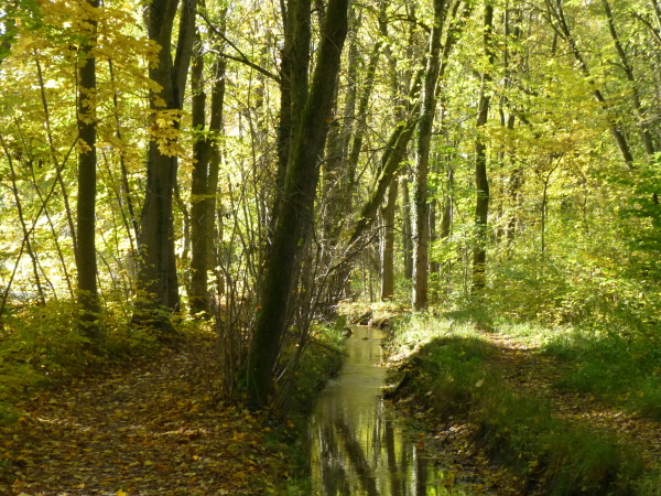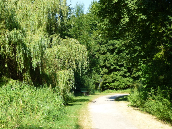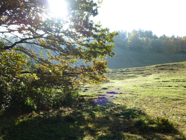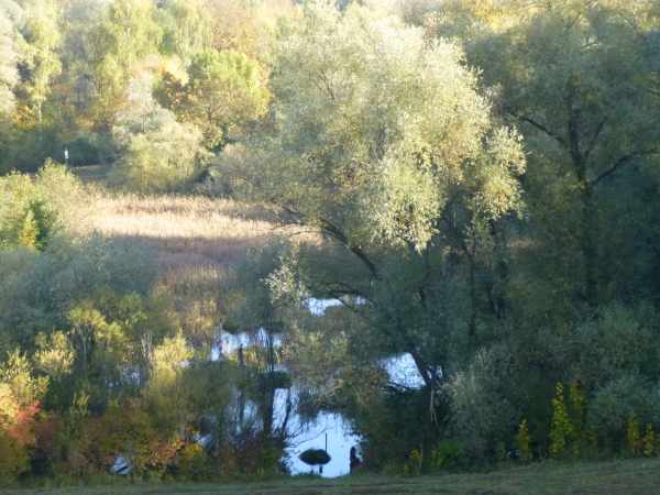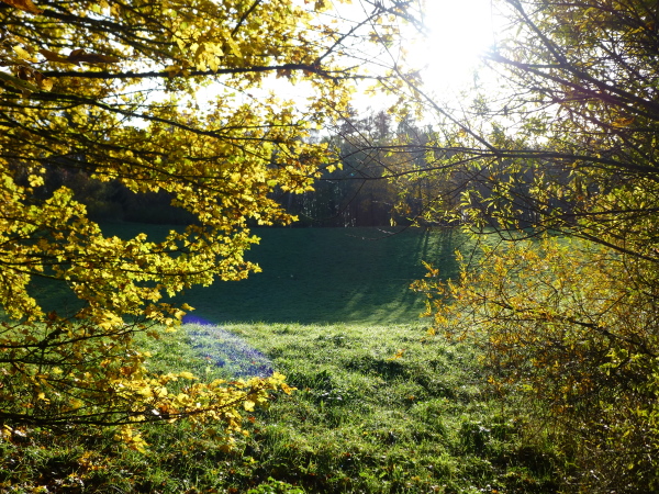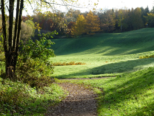 Auf einer langen Abwärtsgeraden werden wir in vollem Lauf unvermittelt ausgebremst und auf einen schmalen, steinigen Pfad gelotst. Wieder geht es ein Stück hinauf, bis wir den Wegering erreichen, der rund um das Areal des Teufelsbergs führt. Zu dessen Füßen öffnet sich der Wald zu weiten Wiesenhängen, winters ein Dorado für die Rodler (wenn denn mal Schnee liegt). Ohne Zweifel eine der schönsten Ecken der Lohe ist dies, was auch an den verwunschenen Weihern, ehemaligen Ton- und Lehmgruben, liegt, die zu idyllischen Biotopen umgewandelt wurden. Im Slalom windet sich der Weg, immer neue Ausblicke bietend, durch die Landschaft. Der tempobolzenden Läuferschar dürfte dies vielleicht gar nicht so bewusst werden. Ich kenne es aber, zu jeder Tages- und Jahreszeit, bei jedem Wetter: Denn hier ist mein Laufrevier, quasi direkt vor meiner Haustür.