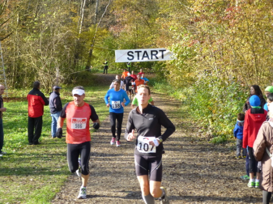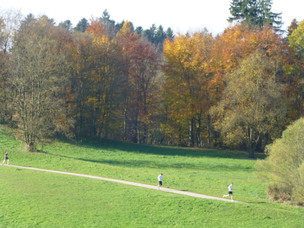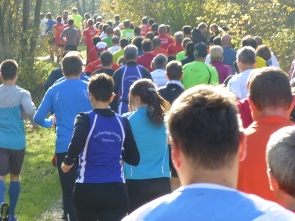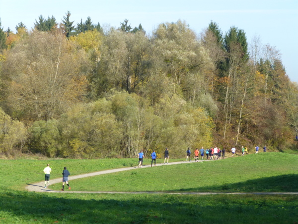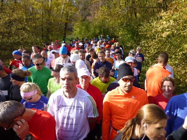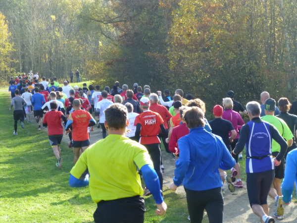 Der Top Act ist und bleibt jedoch der Hauptlauf um 12 Uhr. Hochbetrieb herrscht schon vor dem Start auf den sonnenüberfluteten Wiesen vor dem Startterrain. Die einen laufen sich warm, andere treffen sich zum Fotoshooting, wieder andere genießen einfach relaxt das herbstliche Idyll. Erst kurz vor High Noon wird es voll hinter dem Startbanner. Moderator Klaus Ruscher, Münchner Triathlon- und Laufladenikone, bringt die Läufergemeinde verbal auf Touren und ehe wir uns versehen, scheppert schon die Startklappe.