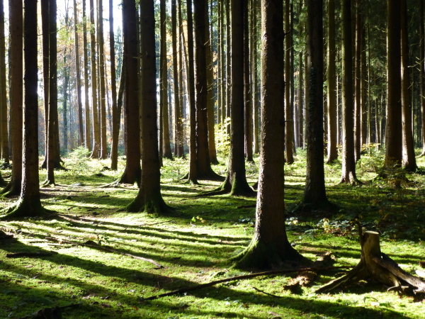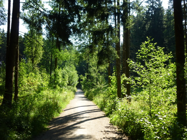 Dort, wo ein Meer aus Fichtenstämmen die Lohe verfinstert, zeigt das Wegenetz durch die Lohe ein anderes Bild. Schnurgerade durchschneiden einige breite Forstwege den Wald. Auf diesen Wegen bewegen wir uns in der Folgezeit fort und laufen dabei eine Art Rechteck aus. Einige Streckenposten stehen an den neuralgischen Punkten bereit und sorgen dafür, dass niemand vom rechten Weg abkommt. Ansonsten ist der Weg auch mit Kreidepfeilen auf dem Boden markiert.