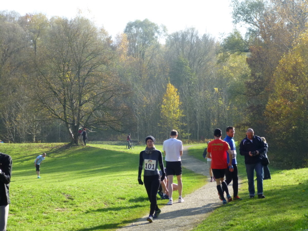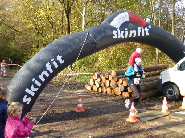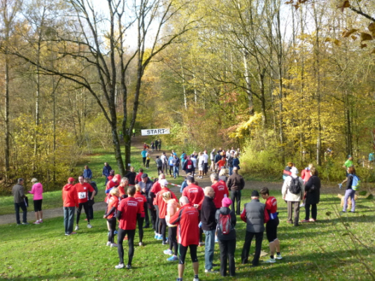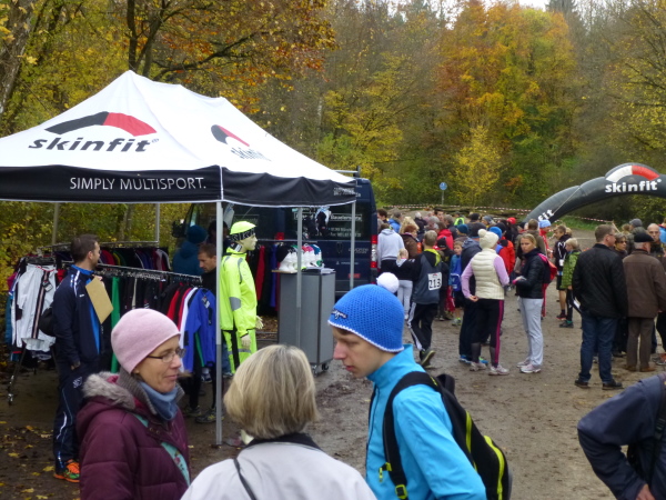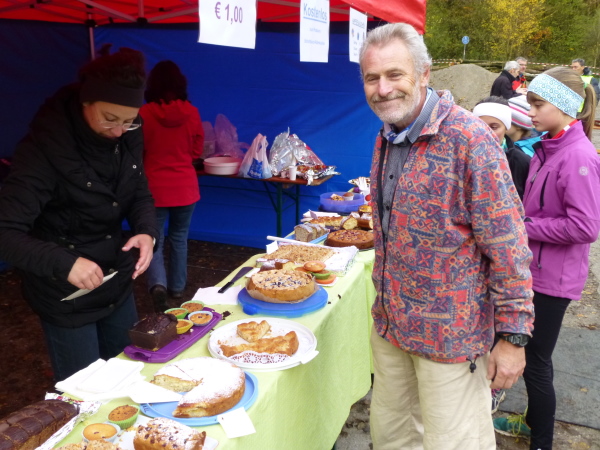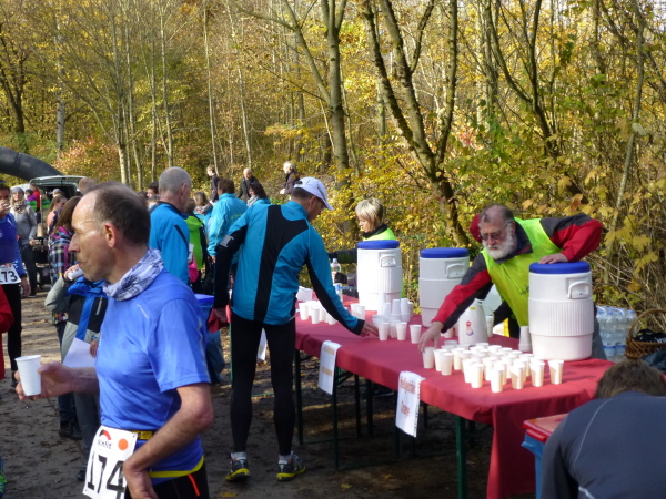 Weiter pilgern die Läufer zum nahen Zielgelände am Rande des Parkplatzes. Eine kleine Zeltstadt ist hinter dem schwarzen Zielbogen aufgebaut. Eines der Zelte steht für Umkleide und Kleiderablage bereit, unter einem anderen findet die Ein-Stand-Messe statt. Den wohl größten Andrang verzeichnet das Zelt, vor dem ein veritables Kuchenbuffet und andere Leckereien bereit steht. So wird der läuferische Familienausflug auch kulinarisch zum Erlebnis. Heißer Tee in verschiedenen Geschmacksrichtungen wird ausgeschenkt. Heute muss dank milder Novembersonne zwar keiner frieren, aber die Historie des Laufs kennt auch winterliche Extreme.