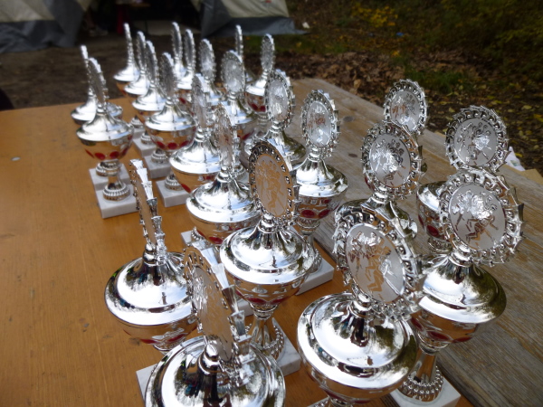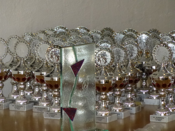 Der Teufelsberglauf ist damit aber noch nicht zu Ende. Nachfeiern ist in der Vereinsgaststätte des ESV Neuaubing angesagt. Einziger Wermutstropfen: Die ist etwa drei Kilometer entfernt und wer eine (Mit)Fahrgelegenheit per Auto hat, ist eindeutig im Vorteil. Entgehen lassen sollte man sich diese Feier aber nicht. Denn zur Tradition des Laufs gehört auch, dass sich eine wahre Pokalflut über die erfolgreichsten Teilnehmer ergießt. Belohnt werden, getrennt nach Männlein und Weiblein, jeweils die ersten drei jeder Altersklasse. Bei einer Wertung nach 5-Jahres-Klassen kommt da Einiges zusammen. Ich bin wie immer nicht dabei und werde wohl noch auf das Erreichen der M70 warten müssen: Da ist dann jeder auf dem Treppchen. Aber selbst, wer keinen Pokal "abstaubt", darf hoffen, gegen Abgabe der Startnummer ein nettes Präsent aus der Tombola zu ergattern.