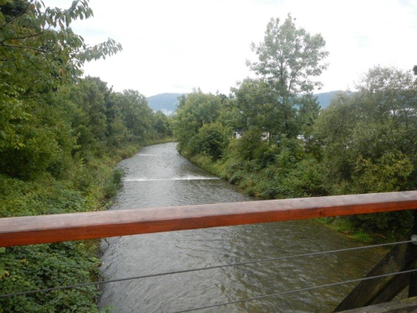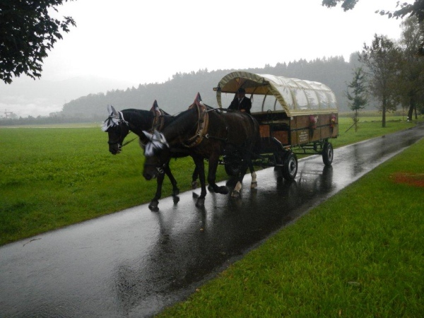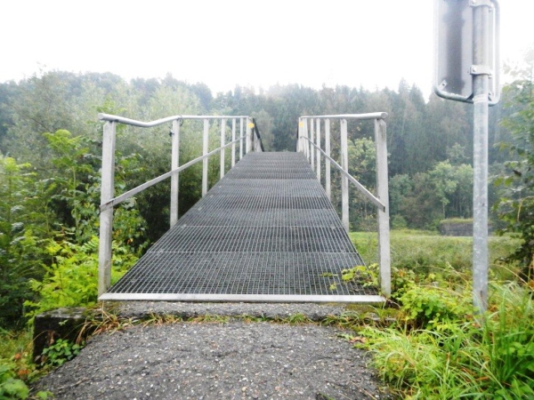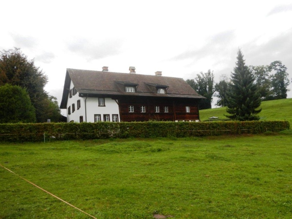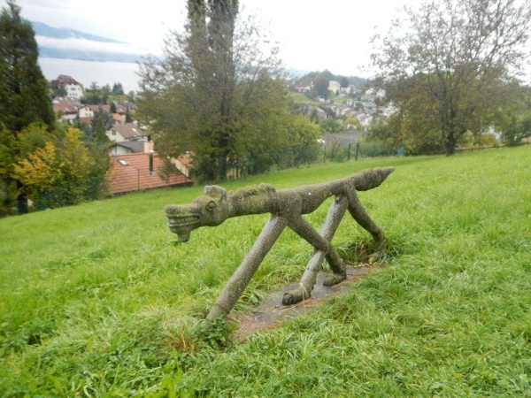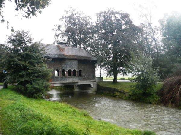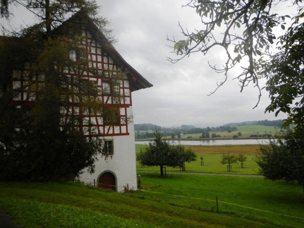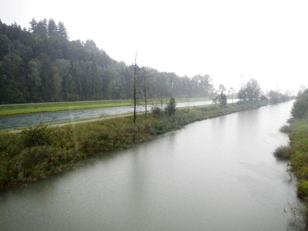 Ein genaueres Kartenstudium im Vorfeld bringt Vorteile. Zum Beispiel den, dass man nicht überrascht ist, wenn der Weg nicht direkt dem östlichen Ende des Zürichsees entlang geht, sondern weiter entgegen der Fließrichtung des Wassers. Zuerst ist dies der Aabach, der auf einer gedeckten Holzbrücke überquert wird. Ein Kutscher kommt mir mit seinem Zweispänner entgegen und meint: „Da habt ihr euch keinen guten Tag für euer Unterfangen ausgesucht!“ Sicher wäre es mit weniger Nässe angenehmer; fürs Laufen ist dieser Landregen, zu welchem sich der Niederschlag mittlerweile entwickelt hat, aber sicher weniger störend als für eine Ausfahrt mit der Kutsche.