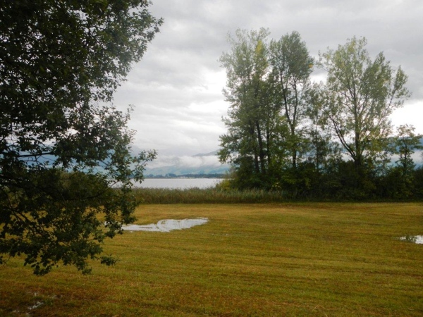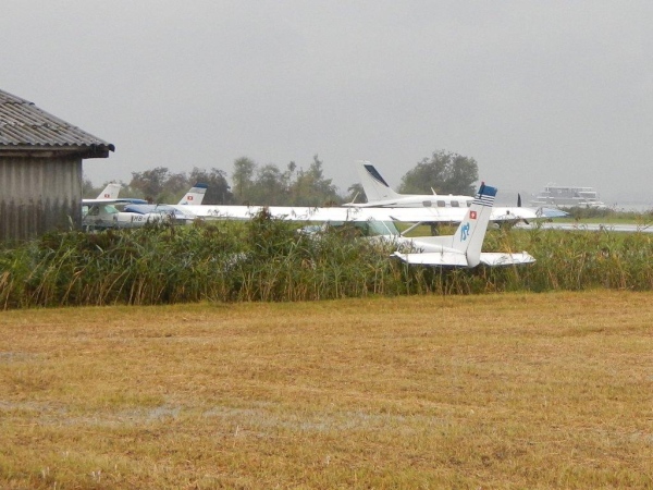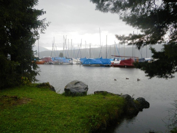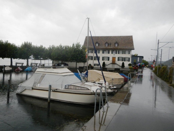Falls ich es noch nicht erwähnt habe: die Regenwelle ist noch nicht vorbei. Der Weg nach Lachen sieht nicht zum Lachen aus. Der Himmel weint und der Kiesweg ist zur wohl längsten Kneippanlage der Welt mutiert. Plötzlich stehe ich wenige Meter vor einer Start- und Landepiste. Ich bin nicht vom Weg abgekommen, die Markierungen haben mich bisher richtig gelotst. Das hier ist kein Hochsicherheits-Airport, es ist der Flugplatz von Lachen mit einer Piste, die kaum länger als breit ist. Wenn nach Westen gestartet werden muss, was fast immer der Fall ist, hat man vorzugsweise einen starken Motor unter der Haube. Und sonst bitte eine ausgeprägte Koordinationsfähigkeit, denn die Ausfahrt aus dem Bootshafen liegt direkt hinter der Piste und die Masten der Segelschiffe sind in der Regel höher als ein Besenstiel…