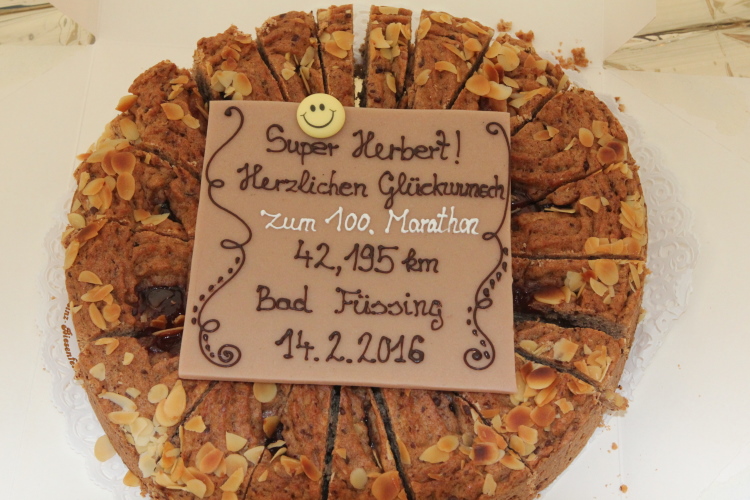 Evi hat einen Ordner angelegt, der die gesammelten Werke meiner Laufberichte aus dem Nachlass meiner Schwiegermutter enthält. Es wird heftig geknipst, ich weiß gar nicht, wo ich hinschauen soll. Klaus Duwe am Drücker, M4Y-Judith (AK-Stockerl) und Andreas Bettingen (schon wieder sub-4 trotz Kamera) haben auch so lange gewartet - ich bin ganz hin und weg. Bernie hat ein Billet aufgelegt, wo ganz viele Unterschriften drinnen sind – Danke sehr und Danke all jenen, die mit mir gefeiert haben.