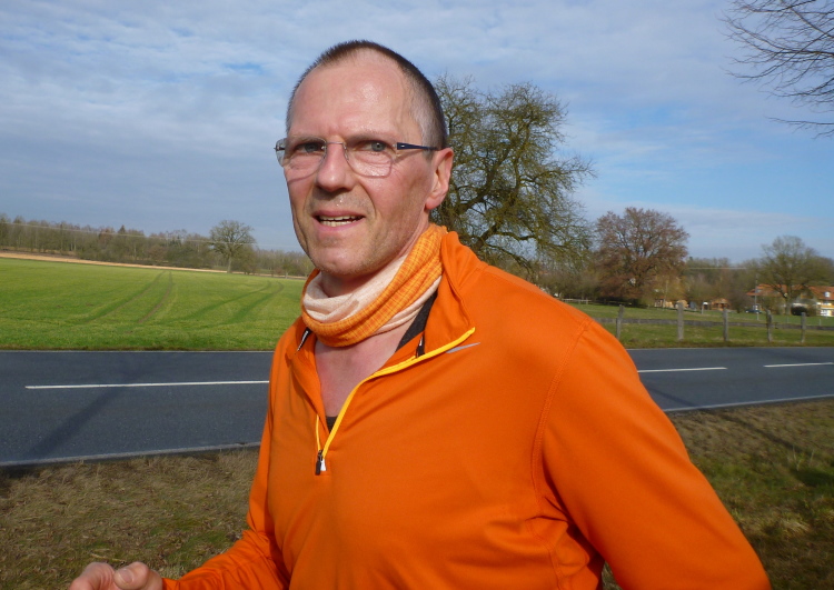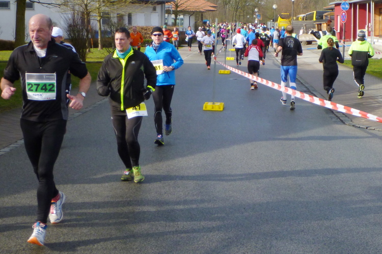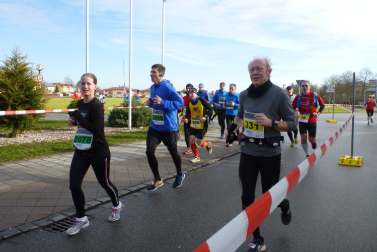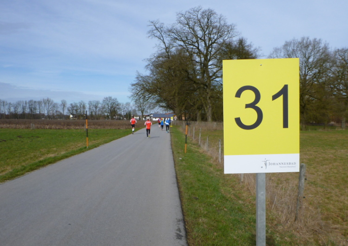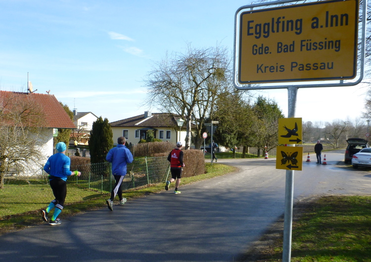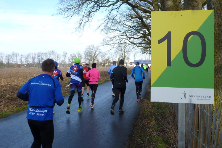 Hier und jetzt in Bad Füssing haben wir Glück, morgens scheint die Sonne. Laut Wetterbericht ist mit allem zu rechnen. Um 10 Uhr hat es sich leicht eingetrübt, es starten Marathon und Halbmarathon, weitgehend windstill. Wir laufen zwei Mal über eine Umfahrungsstraße, dann geht es flach weiter. Ich überhole Franz Lang, er läuft heute seinen 150. Marathon, wir kennen uns persönlich vom Málaga-Marathon 2014 und in Bremen 2012 waren wir auch gemeinsam am Start.