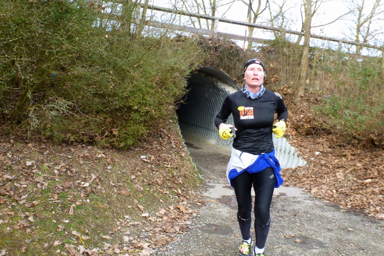 Nach km6 folgt eine kurze Pendelstrecke, meine Laufkumpane sind unmittelbar hinter mir. Dann geht es durch einen niedrigen Wellblechtunnel unter einer Straße durch, nun sind wir wieder in verbautem Gebiet.
