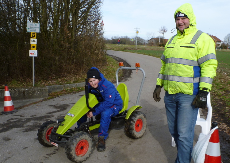 Labestelle mit Wasser, warmem Tee und Iso, super. Es geht um die Johannestherme rum und wieder über die Umfahrungsstraße nach Würding. Mit dem Rest aus meiner Flasche spüle ich ein Power Gel runter. Flach geht es weiter, nach zwei Kreisverkehren, bei km25, die nächste Labe. Sie liegt im Schatten und hat auf Anfrage sogar Bier im Angebot. Ich kann widerstehen.