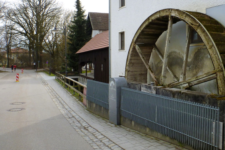 Ein leichtes Gefälle am Mühlbach, vorbei an einem alten Mühlrad, die nächste Kreuzung wird von Feuerwehrleuten bewacht. Deren Dienste sind bei so einer Laufveranstaltung nicht weg zu denken. Km9, wir biegen ein Richtung Start und Ziel, den folgenden Streckenabschnitt haben wir 4x zu bewältigen, denn von rechts mündet die 2. Runde ein, etwa km19.