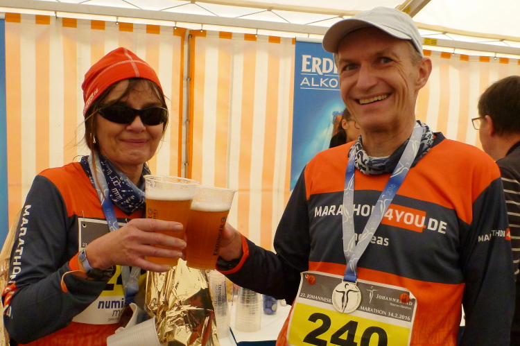 Außerdem Veronika und Franz Hofer, wir sind schon in Rotterdam gelaufen und in Rauchwart. Heute ist Veronikas 20. und Franz’ 40. Marathon. Sie erwarten sich einen entspannten Marathon, wenn sie heute mit mir laufen. Dafür haben sie extra auf ein Skiwochenende verzichtet! Normalerweise laufen sie so früh im Jahr noch nicht Langstrecke. Wie Roman Nöster, der Ischgl verschoben hat, um dabei zu sein. Er und seine Sieglinde waren u.a. Ende Juni mit in Lappland beim Rovaniemi-Marathon, auf Mallorca 2012 und in Berlin bei Dauerregen 2010 eh auch.
